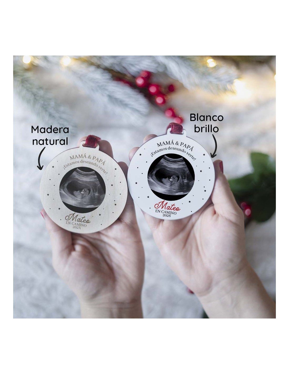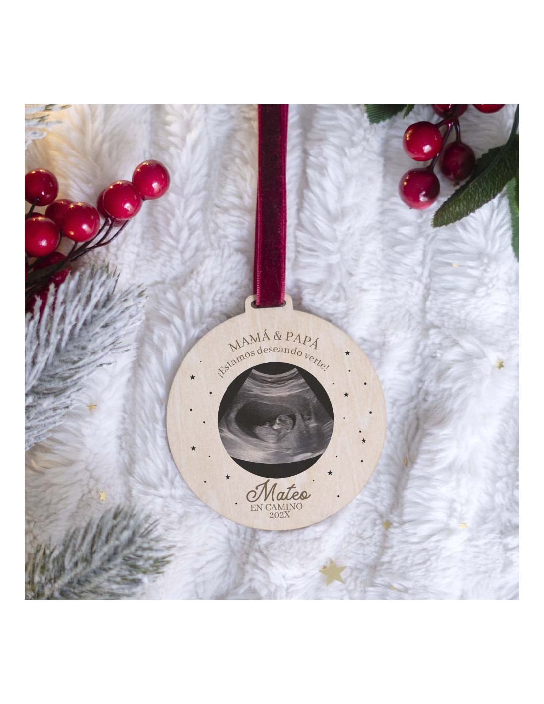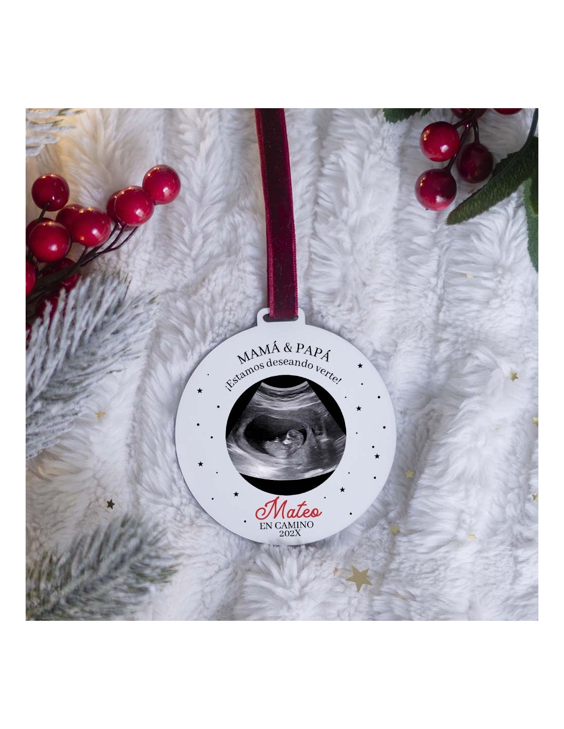 Personaliza este adorno con la foto de la ecografía de vuestro bebé y personaliza el texto. Perfecto para celebrar juntos la magia de cada año.