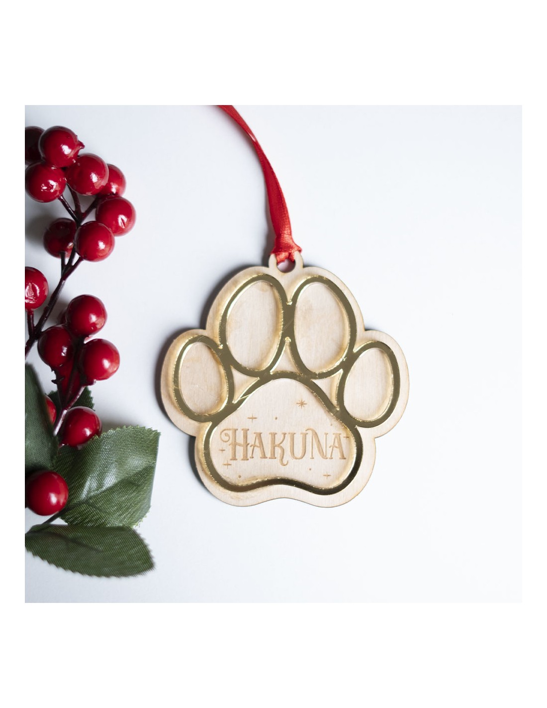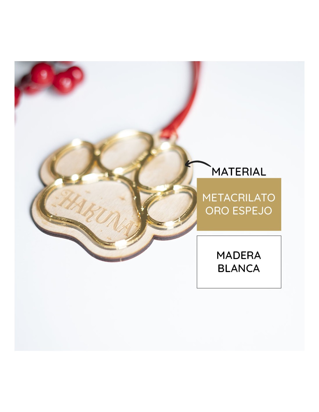 Con forma de huella de perro, disponible en madera blanca o metacrilato dorado, lleva el nombre grabado en el interior y un borde que realza su diseño, creando un recuerdo especial para tu árbol.