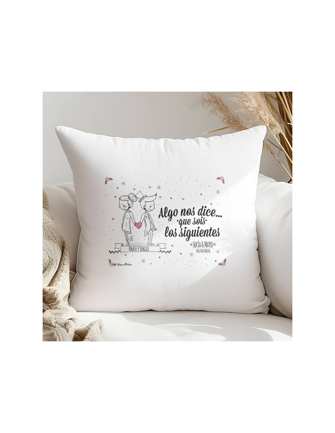 Nuestros cojines son ideales para regalar en ocasiones especiales o para decorar tu hogar. Ya sea para bodas, amigos, o como un detalle único para cualquier habitación, estos cojines añaden estilo y comodidad en cualquier lugar.