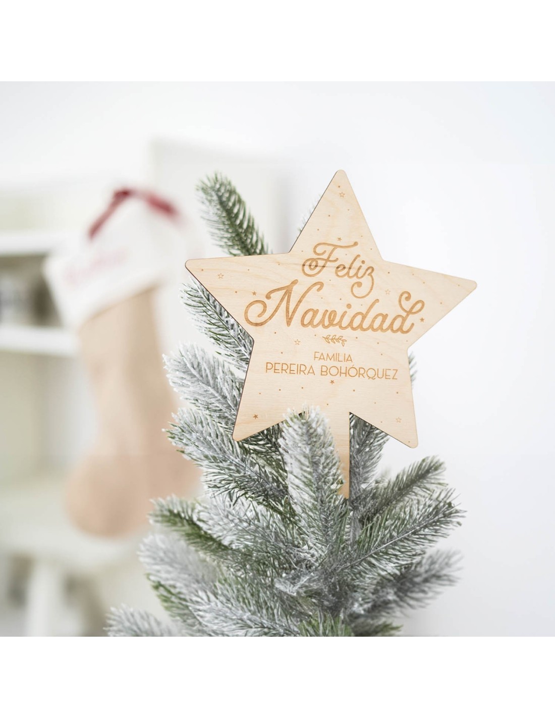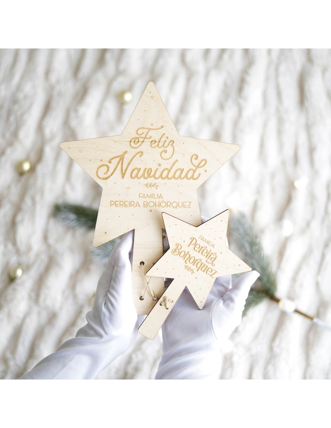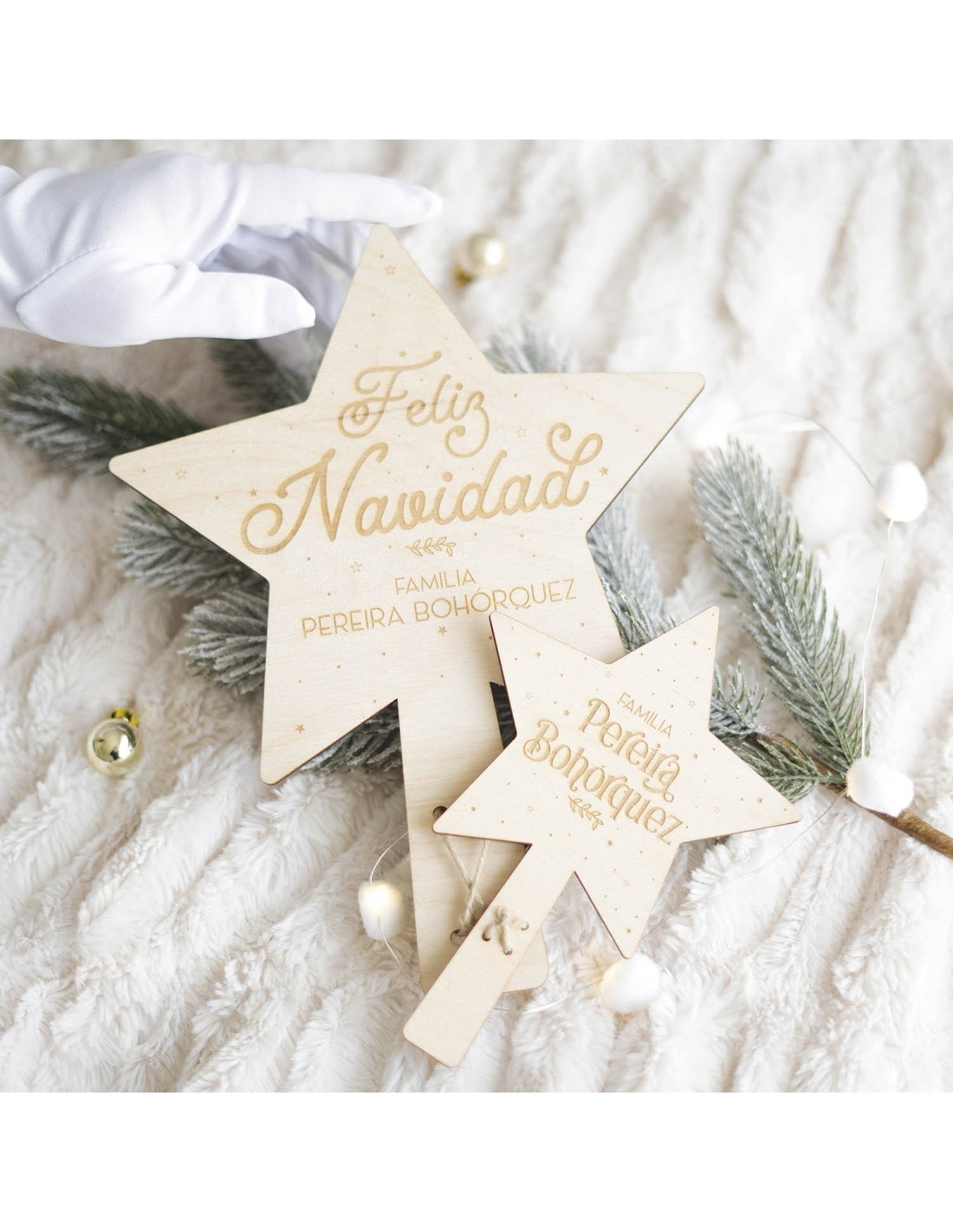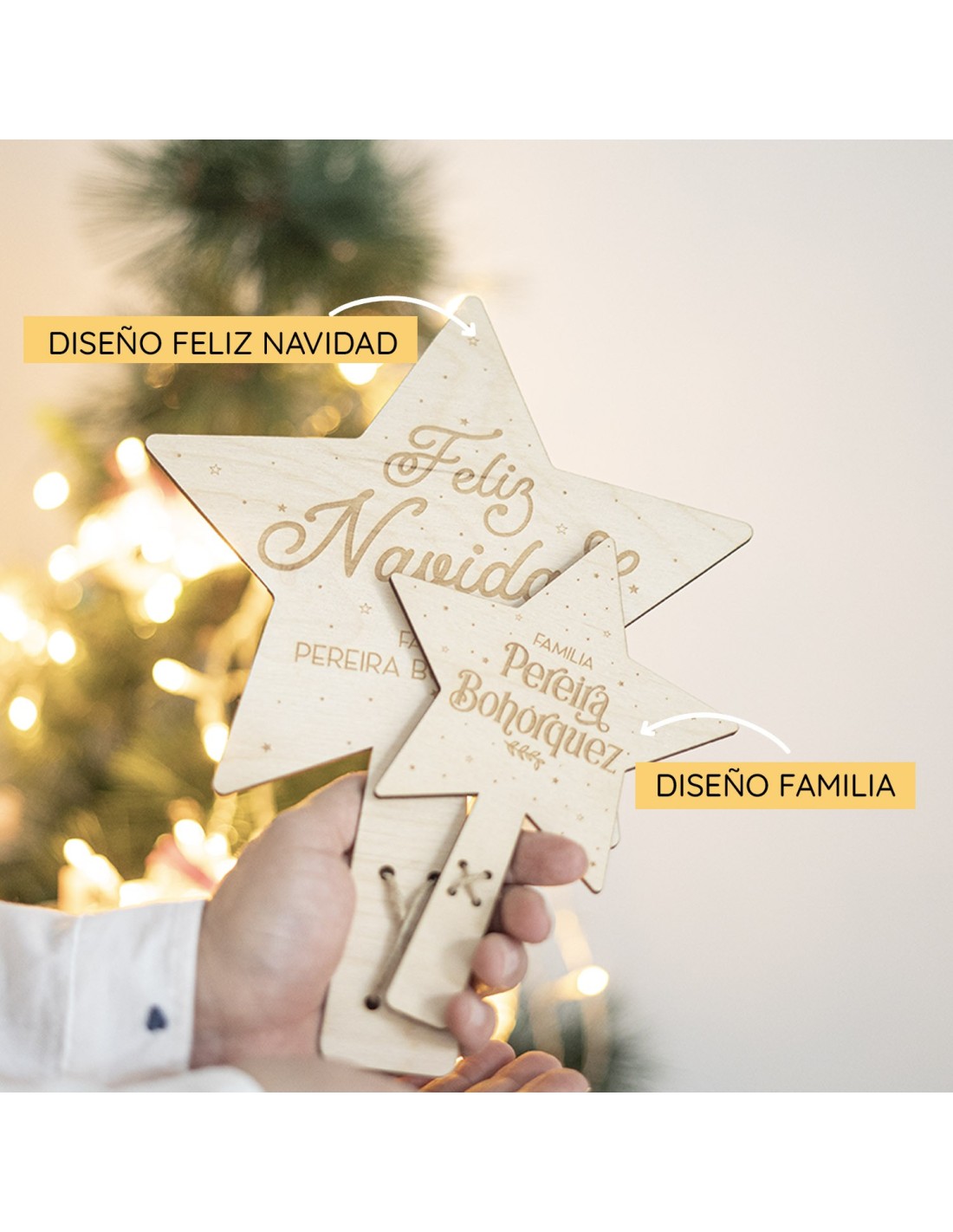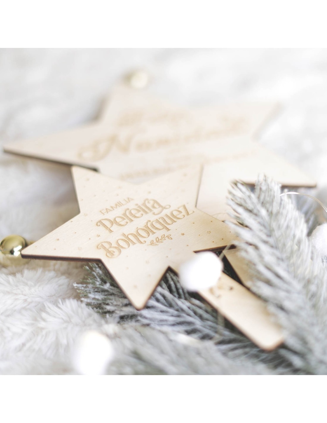 Estrella de madera natural disponible en dos tamaños, personalizable con nombres o frases. Un adorno especial para añadir un toque cálido y familiar a tu Navidad.