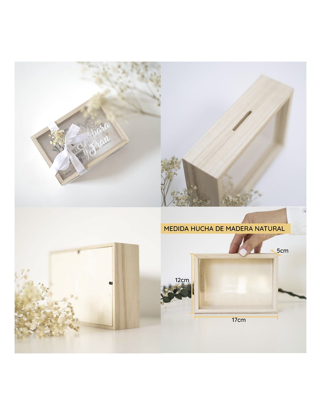 Nuestras huchas de madera están pensadas para ayudarte a soñar en grande. Son un detalle bonito, útil y emotivo, ideal para parejas, amigas, niños o cualquier persona con una meta especial por delante. Personalízalas con nombres, fechas y una frase que lo diga todo, y convierte el gesto de ahorrar en algo que también emociona.