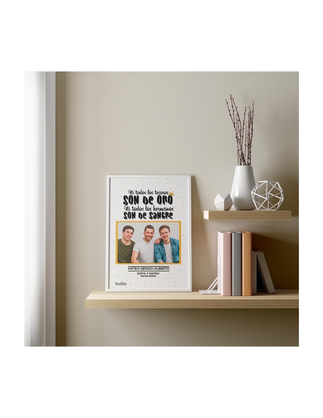 Importante: Si el diseño incluye foto, puedes subirla en orientación horizontal o vertical. Nos encargamos de que se integre perfectamente. Las láminas con marco de 13×18 cm y 21×30 cm incluyen soporte trasero. El tamaño 30×40 cm solo tiene soporte para colgar.