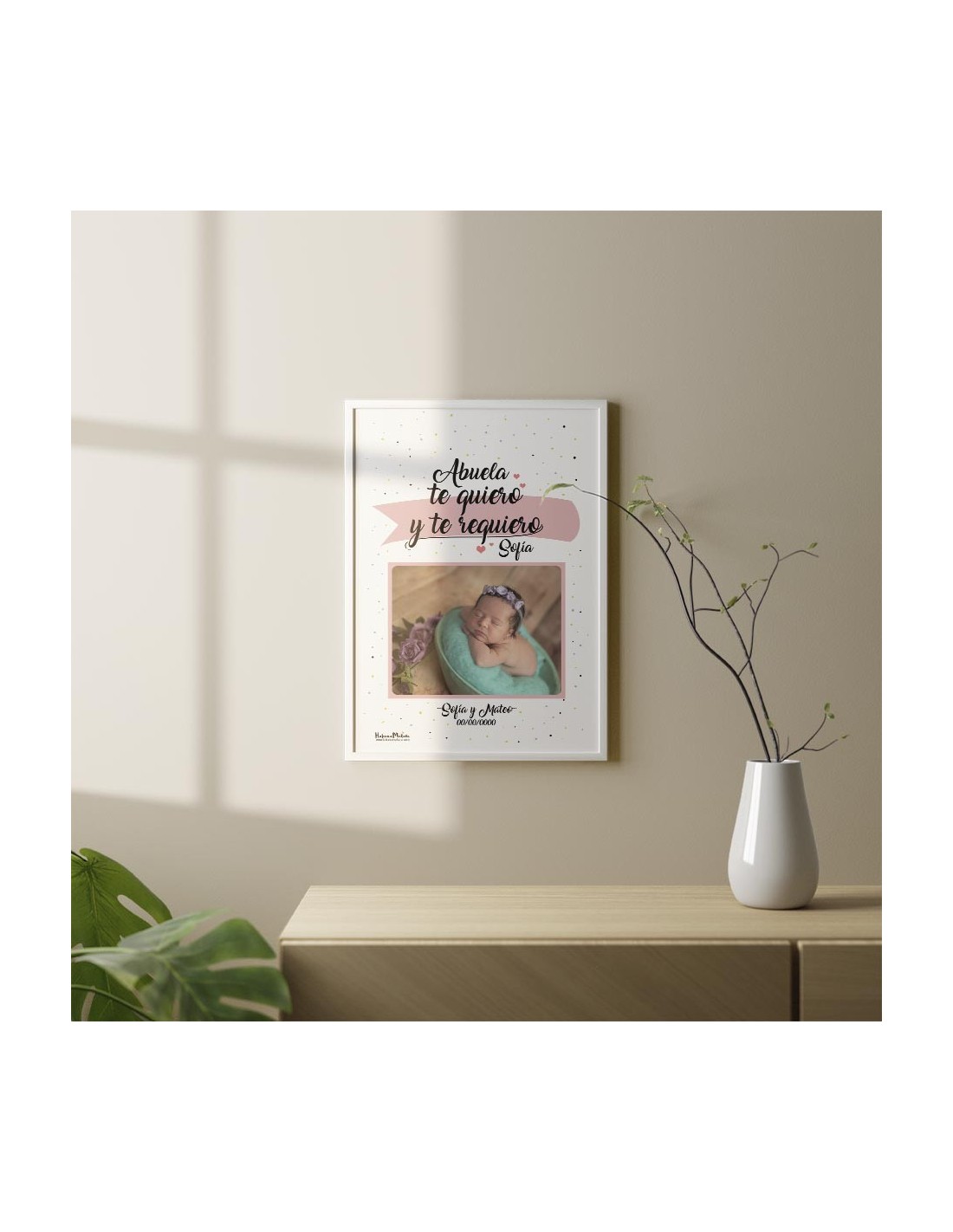 Importante: Si el diseño incluye foto, puedes subirla en orientación horizontal o vertical. Nos encargamos de que se integre perfectamente. Las láminas con marco de 13×18 cm y 21×30 cm incluyen soporte trasero. El tamaño 30×40 cm solo tiene soporte para colgar.