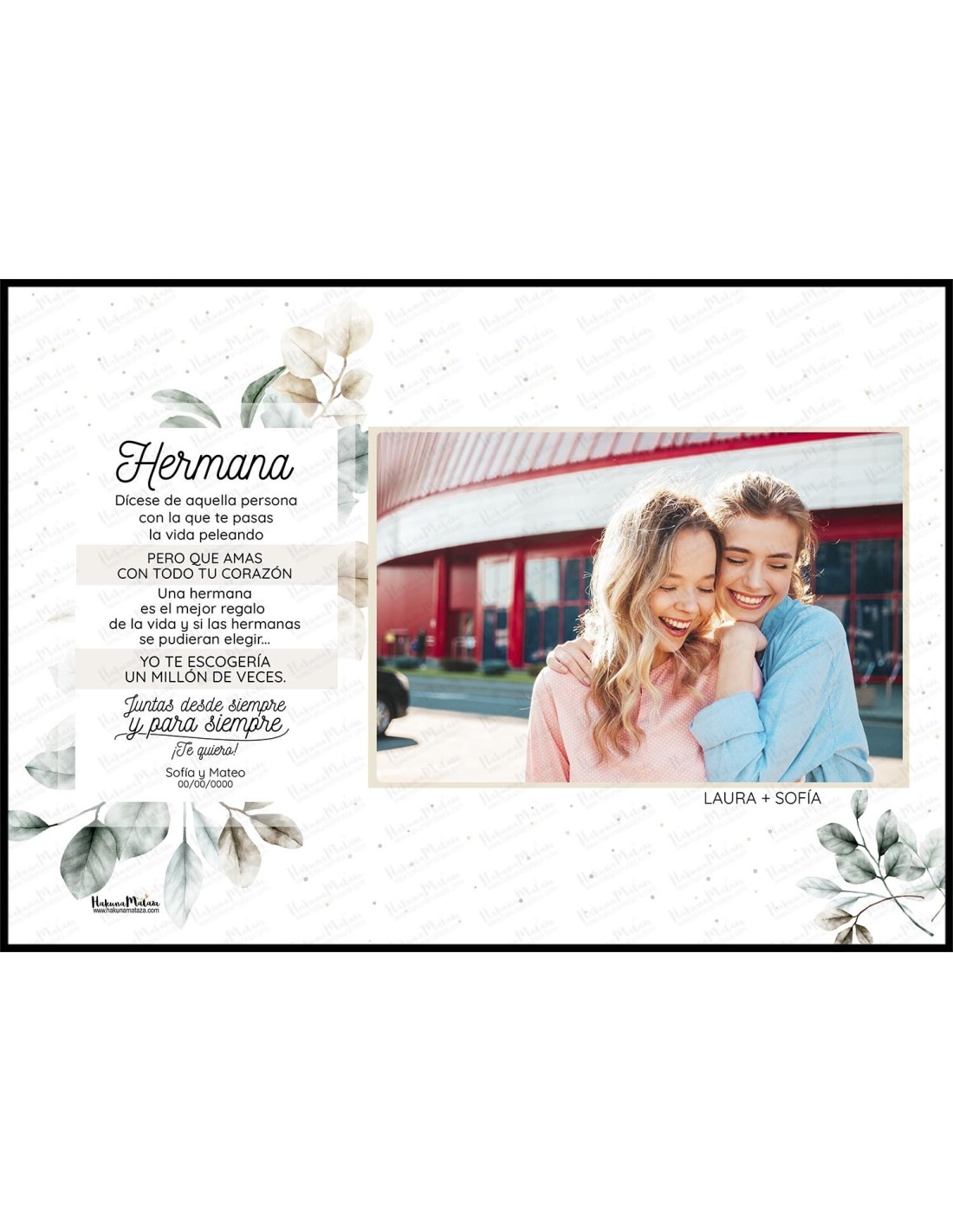 Importante: Si el diseño incluye foto, puedes subirla en orientación horizontal o vertical. Nos encargamos de que se integre perfectamente. Las láminas con marco de 13×18 cm y 21×30 cm incluyen soporte trasero. El tamaño 30×40 cm solo tiene soporte para colgar.