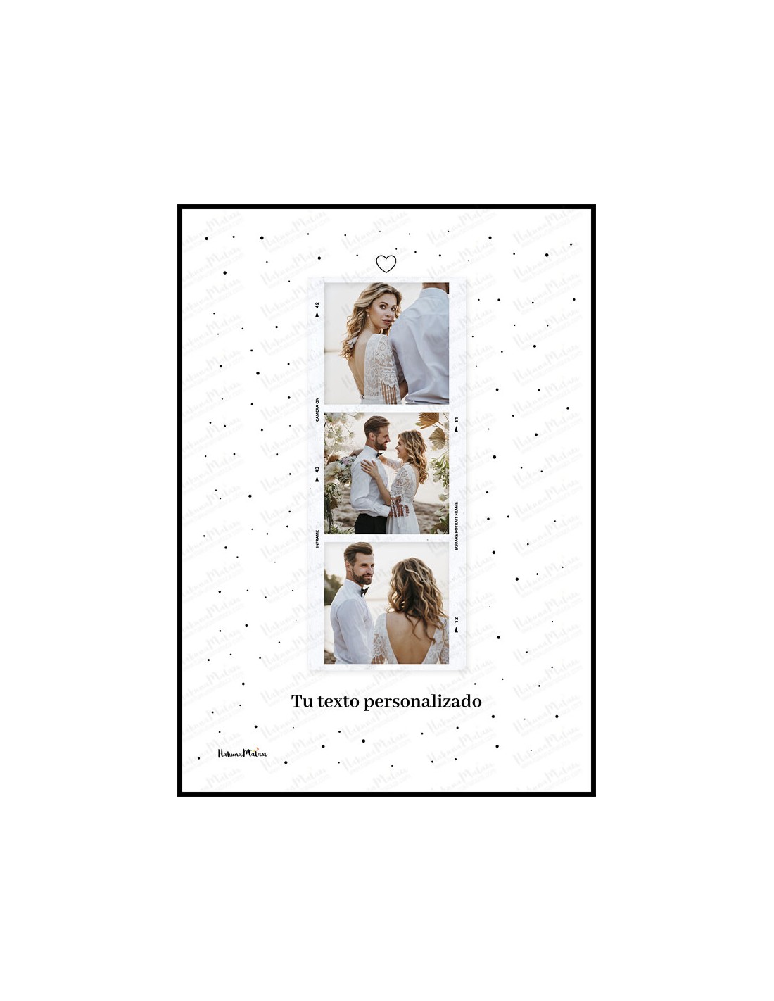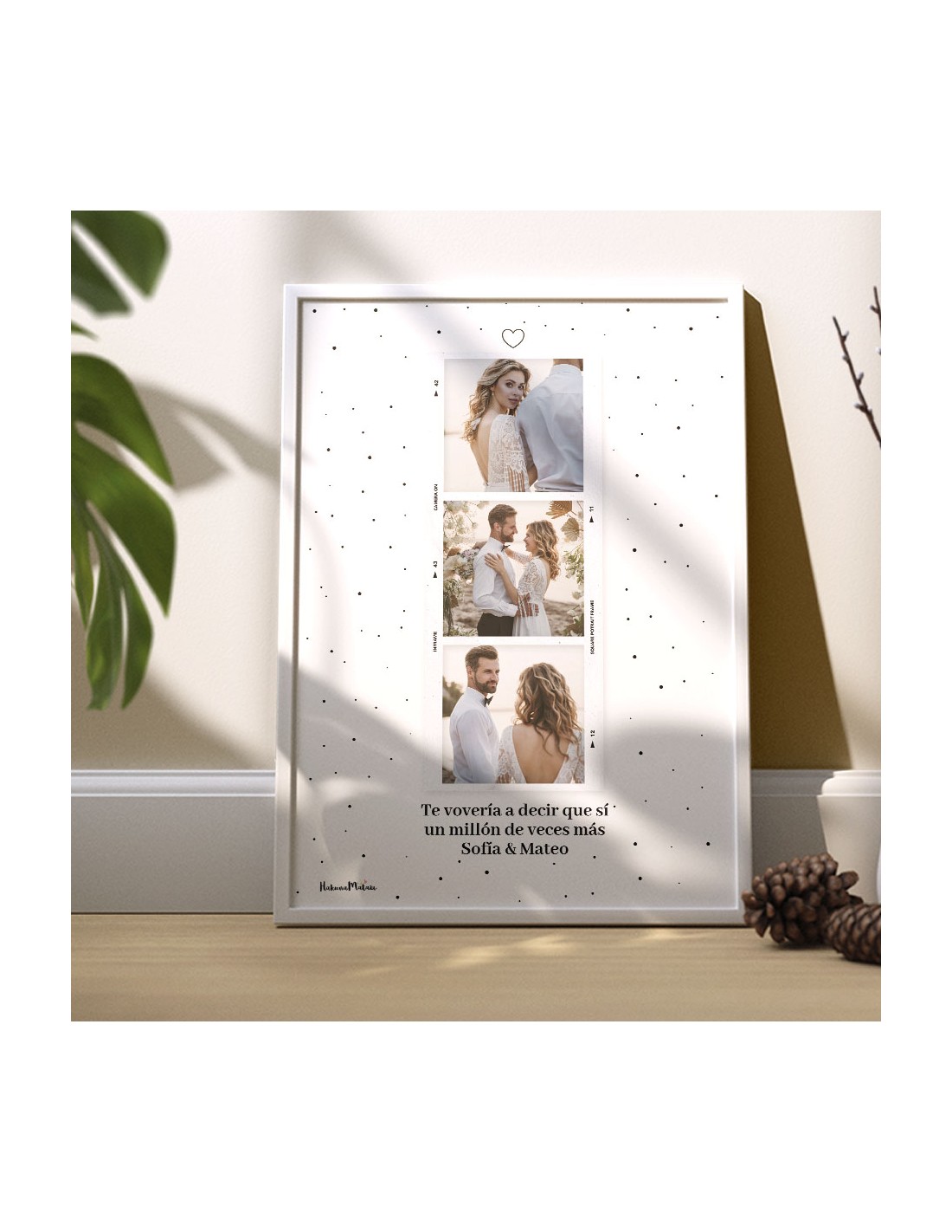 Una historia de amor en tres instantáneas. Esta lámina estilo Polaroid recoge los momentos más bonitos en un formato lleno de ternura.