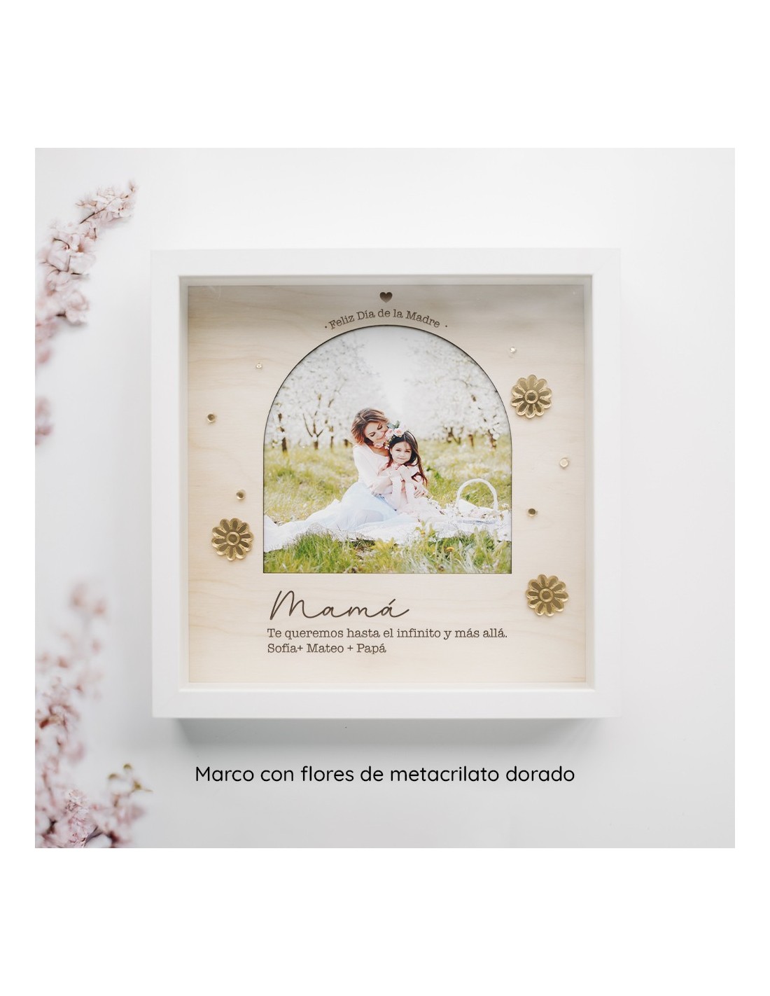 Un regalo que habla por ti: Personaliza cada diseño con los campos indicados en la ficha (como nombres, fecha o parentesco), y sube una fotografía que colocaremos protegida por metacrilato. Algunos modelos también permiten añadir un ramillete de flores preservadas o dejar espacio para que pongas el tuyo en casa.