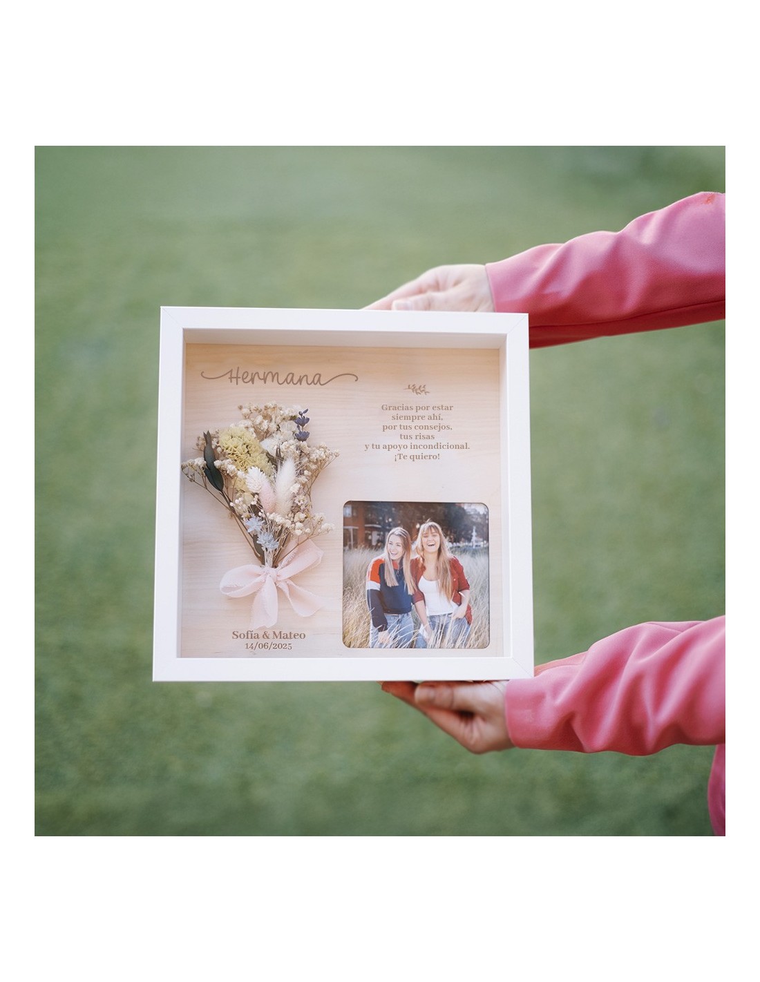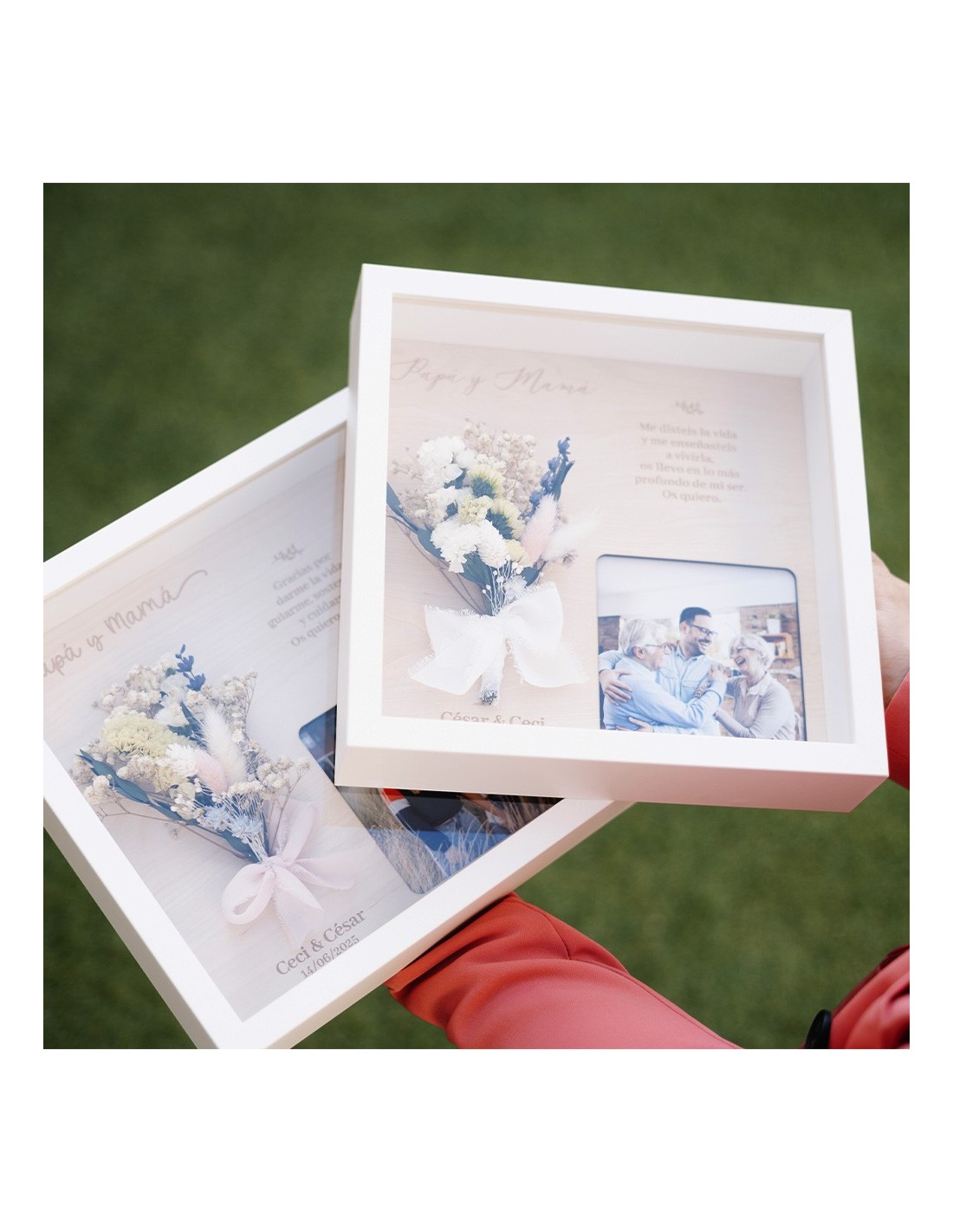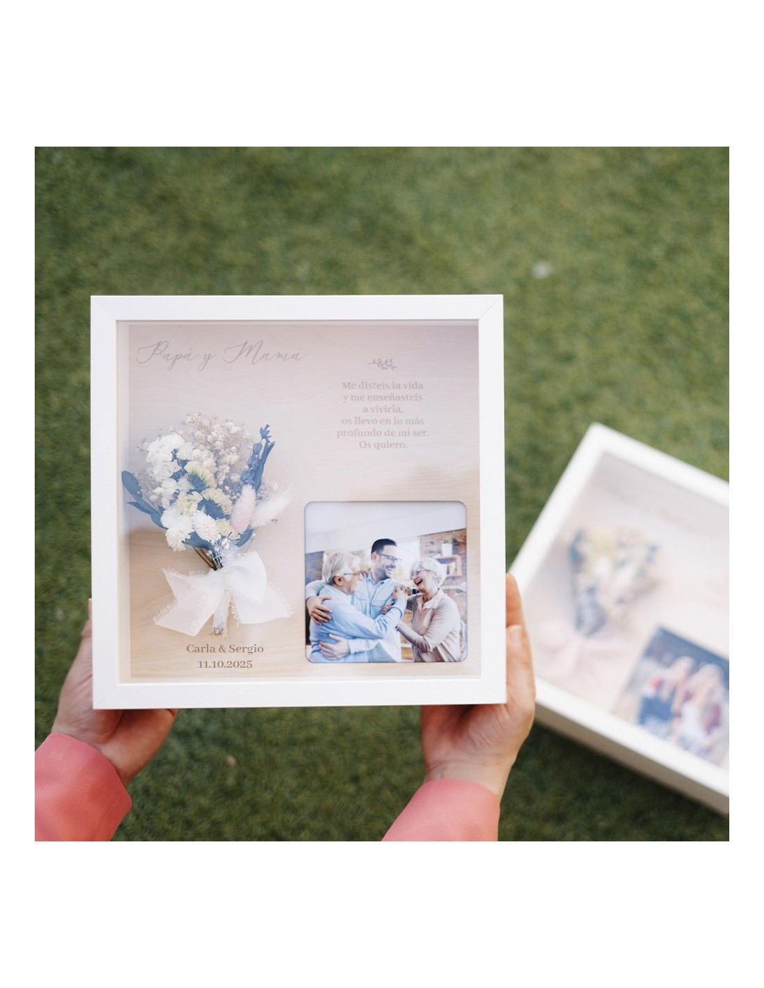 Un regalo que habla por ti: Personaliza cada diseño con los campos indicados en la ficha (como nombres, fecha o parentesco), y sube una fotografía que colocaremos protegida por metacrilato. Algunos modelos también permiten añadir un ramillete de flores preservadas o dejar espacio para que pongas el tuyo en casa.