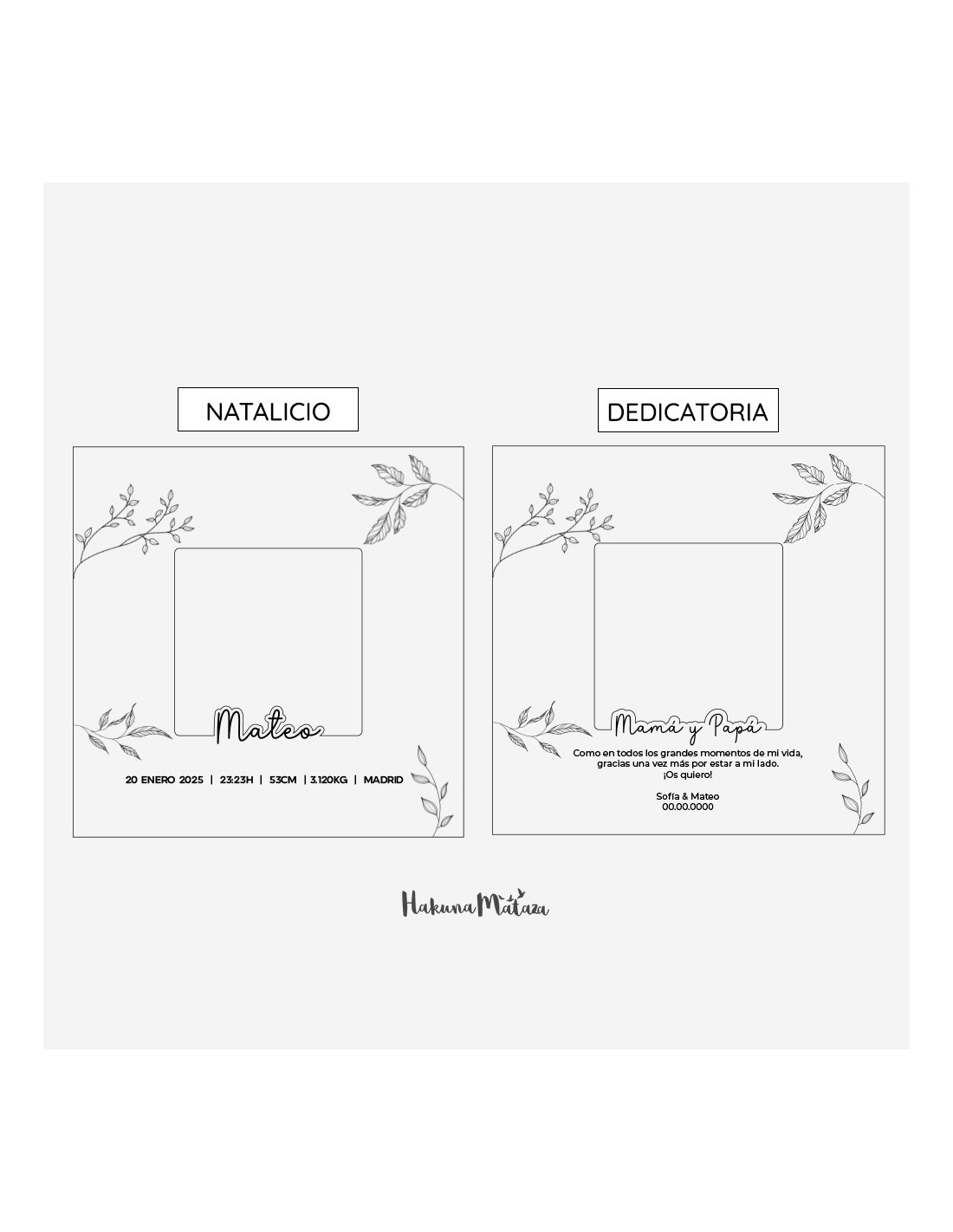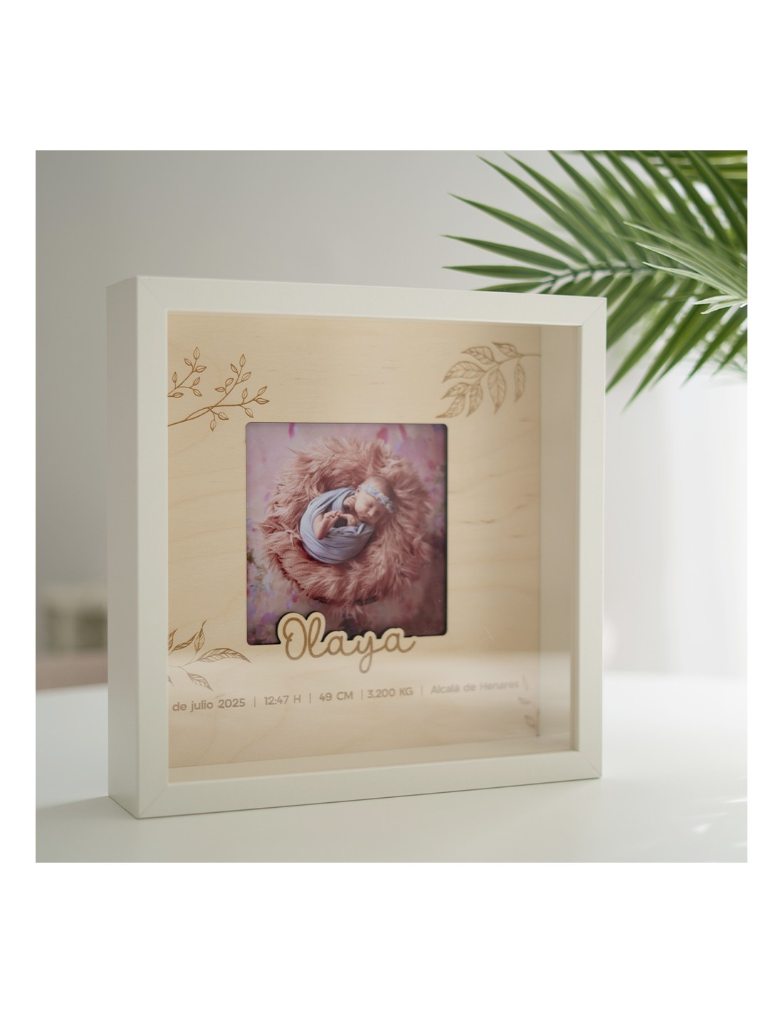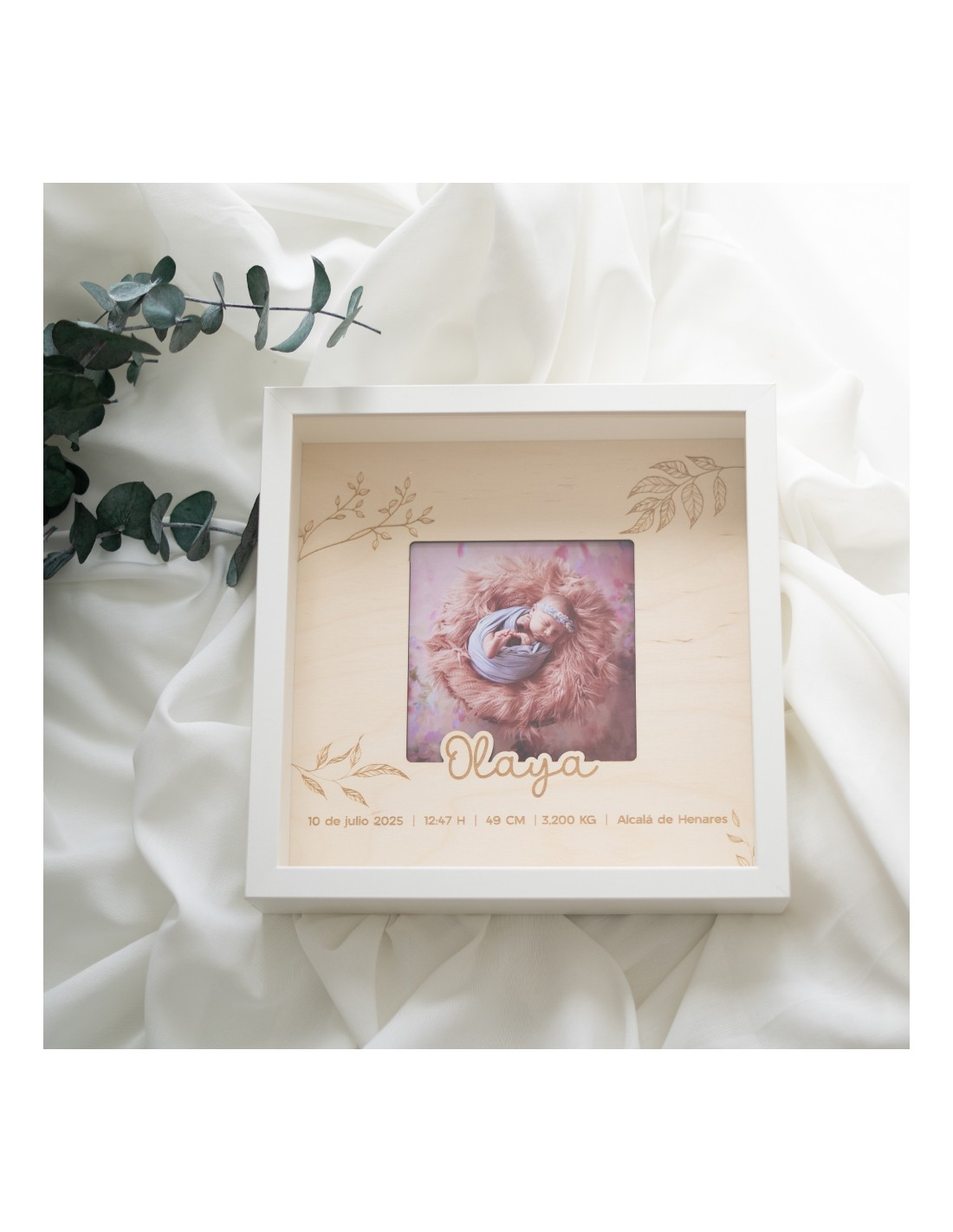 - ✔ Puedes elegir con marco blanco (+10 €) o solo la pieza de madera grabada.