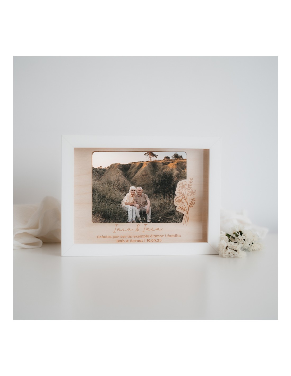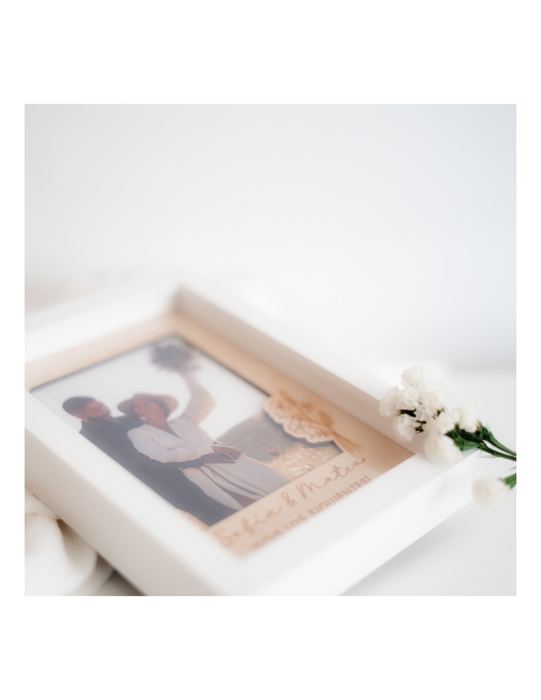 Un detalle delicado para anunciar con emoción que algo bonito está por venir. Este marco de madera lleva grabado el mensaje que elijas y vuestra foto favorita.