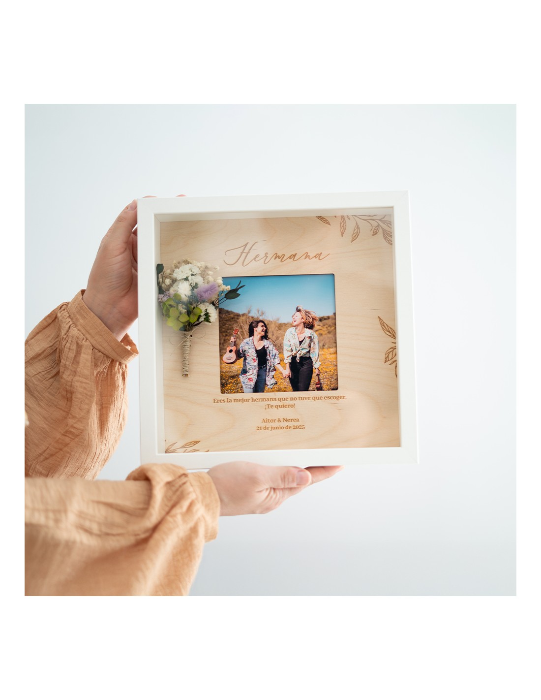 Incluye opción de flores preservadas (+4 €) y elección entre 4 tipografías para el título. Foto protegida con metacrilato.