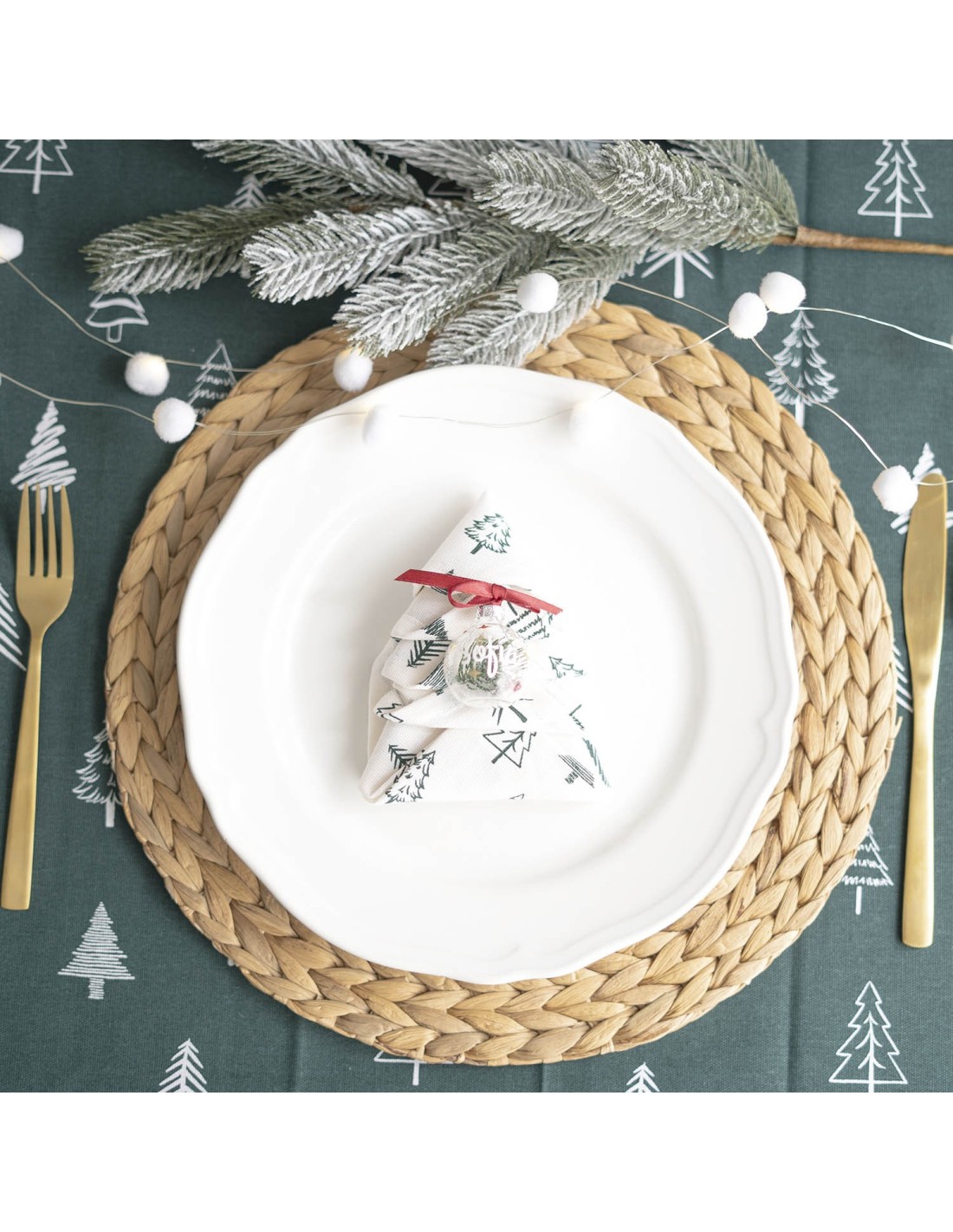 -Un marcasitio de cristal relleno con acebo y nieve, presentado en una cajita blanca individual.