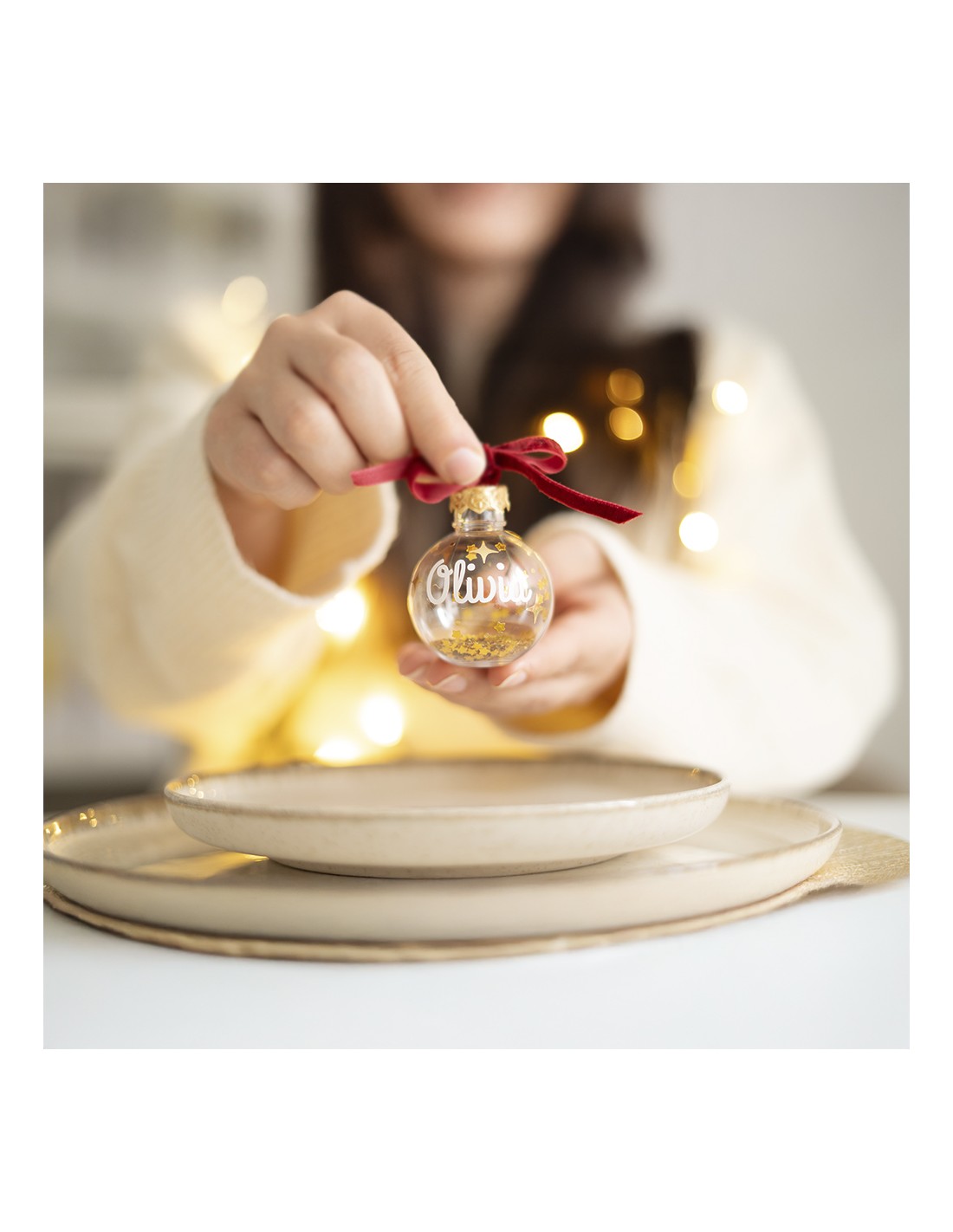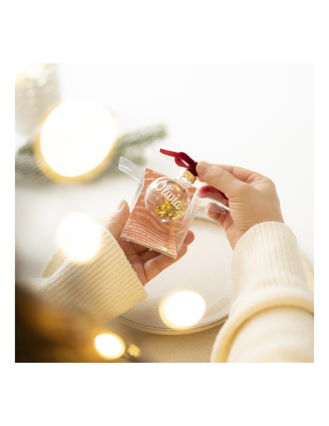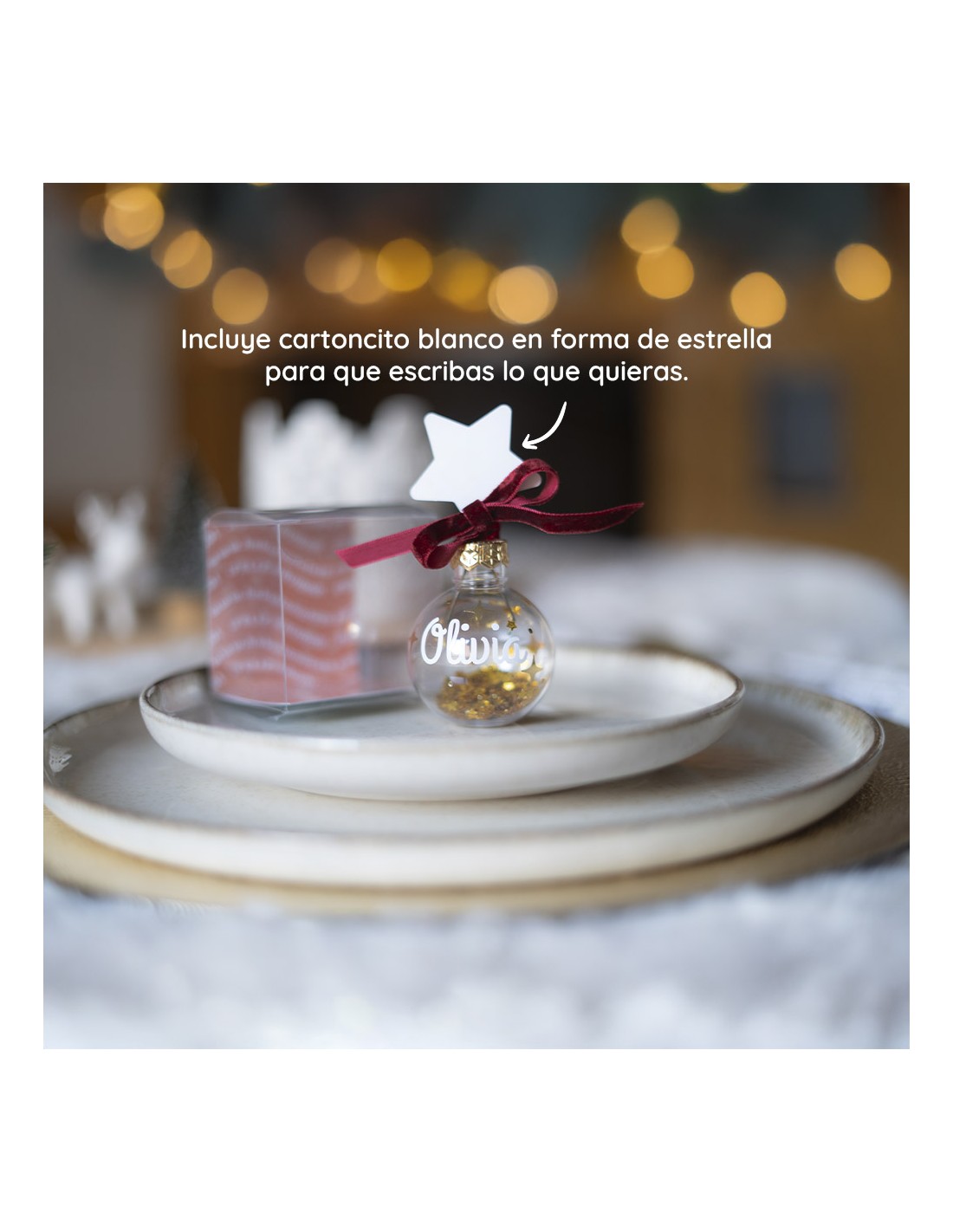 Personaliza con amor: cada marcasitio lleva un nombre en vinilo blanco y estrellas doradas, acompañado de un lazo de satén burdeos. El material plástico de la bola la hace ligera y resistente, manteniendo la magia del relleno diferente según tu elección. Además, incluye un cartoncito en forma de estrella para que escribas el nombre de cada invitado y lo uses como marcasitio en la mesa.