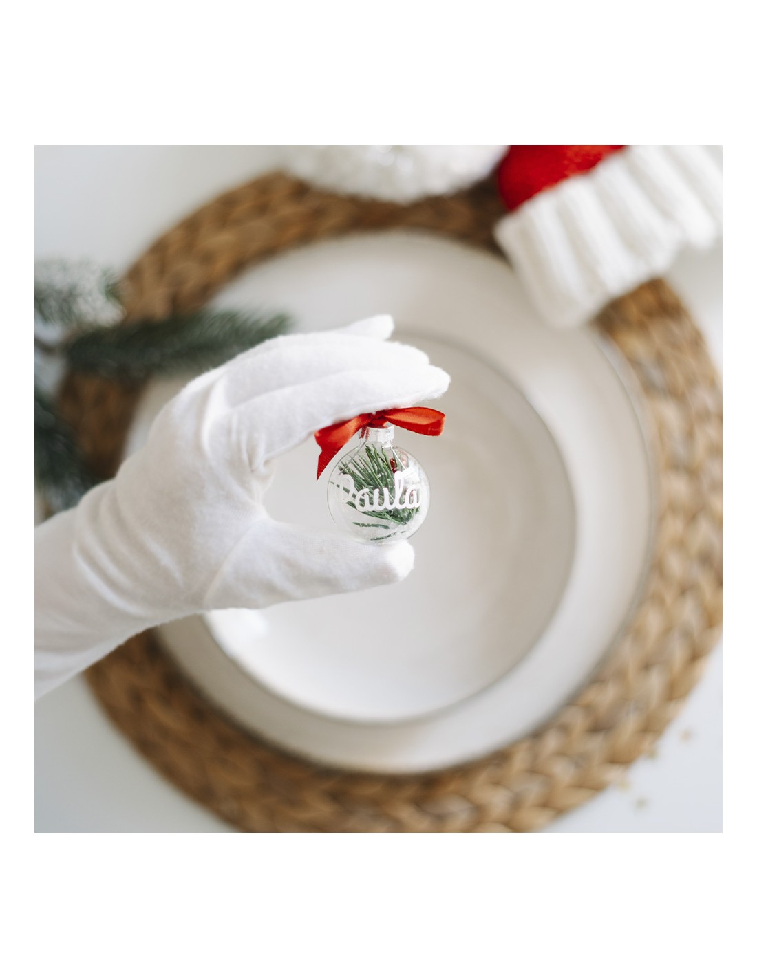 Marcasitio de Navidad de cristal de 4 cm, relleno de acebo rojo con nieve, personalizado con nombre en vinilo blanco y estrellas doradas.