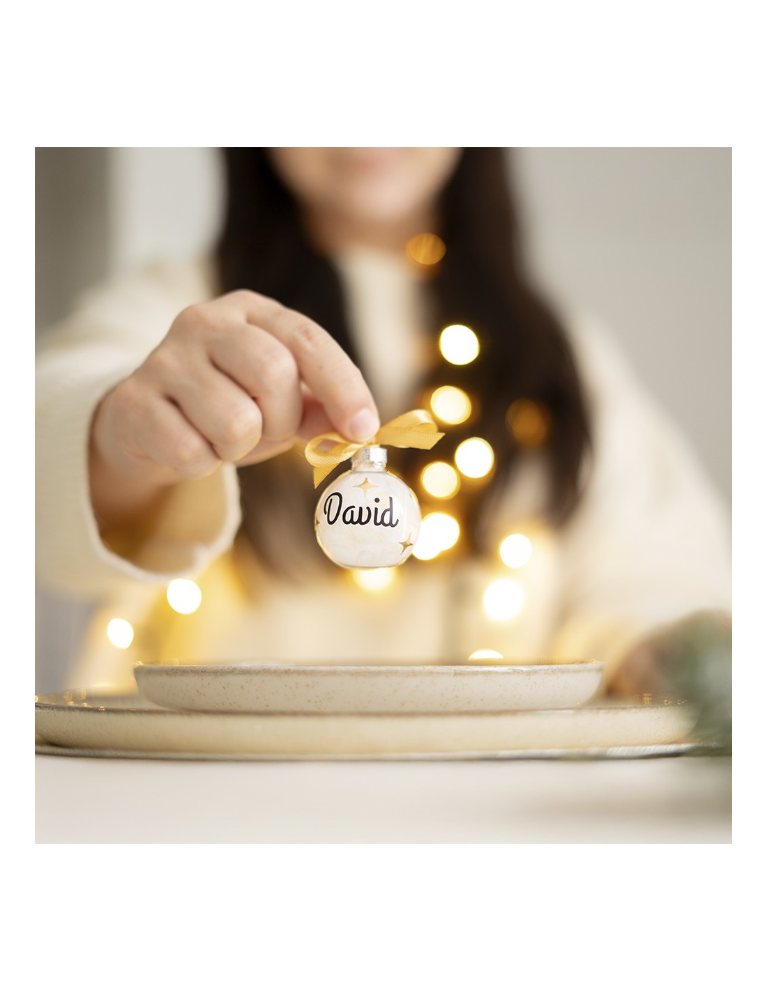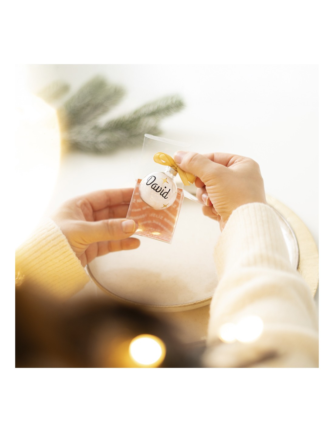 Marcasitio de Navidad de cristal de 4 cm, relleno de plumas blancas, personalizado con nombre en vinilo negro y decoración de estrellas doradas.
