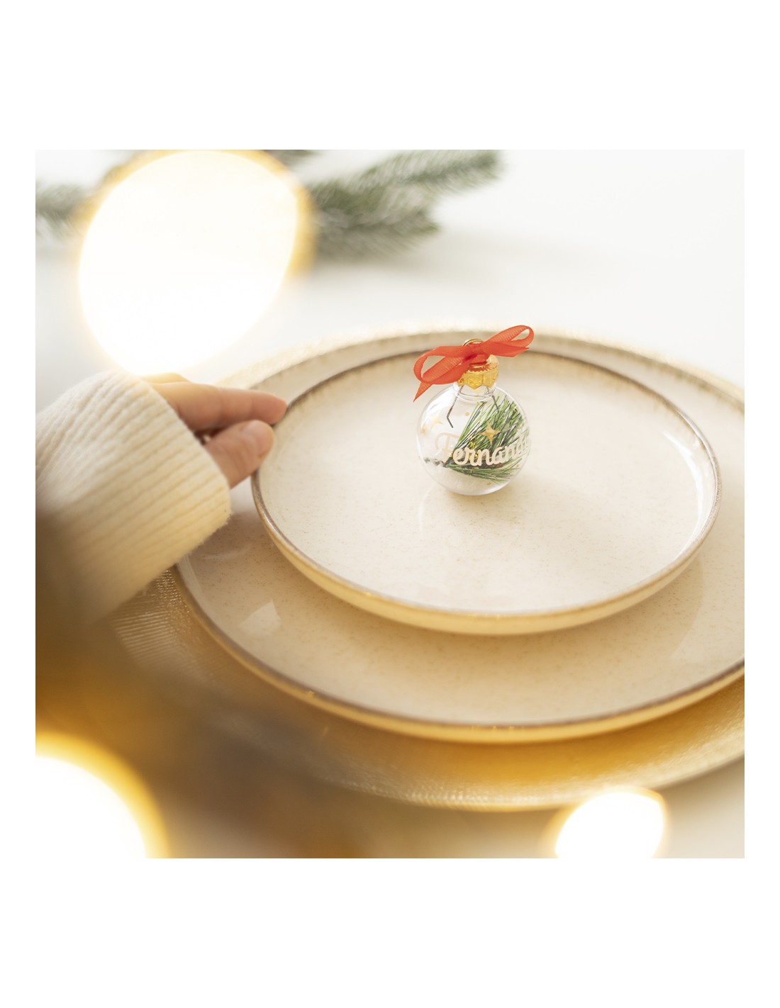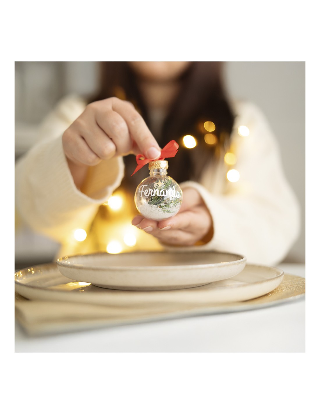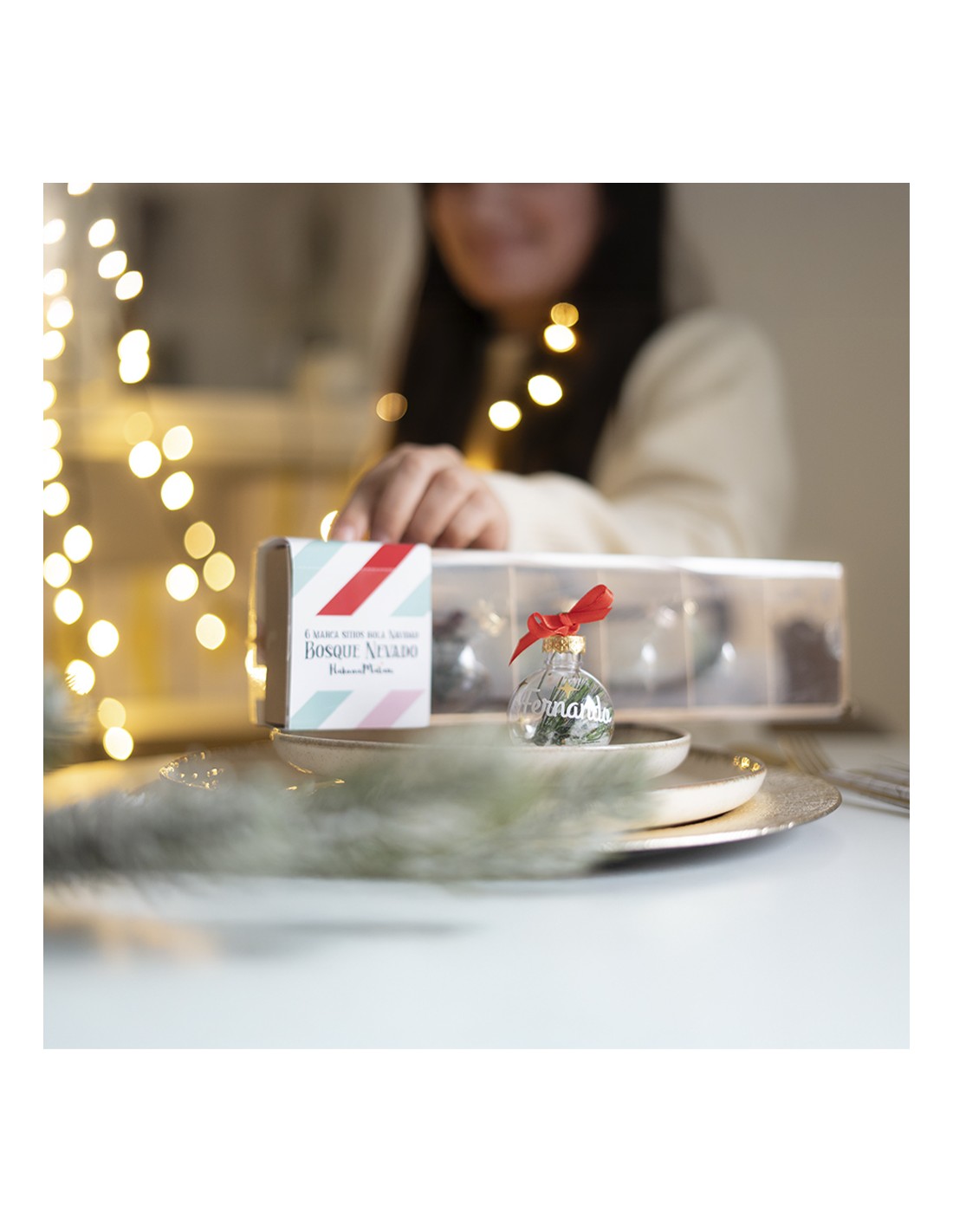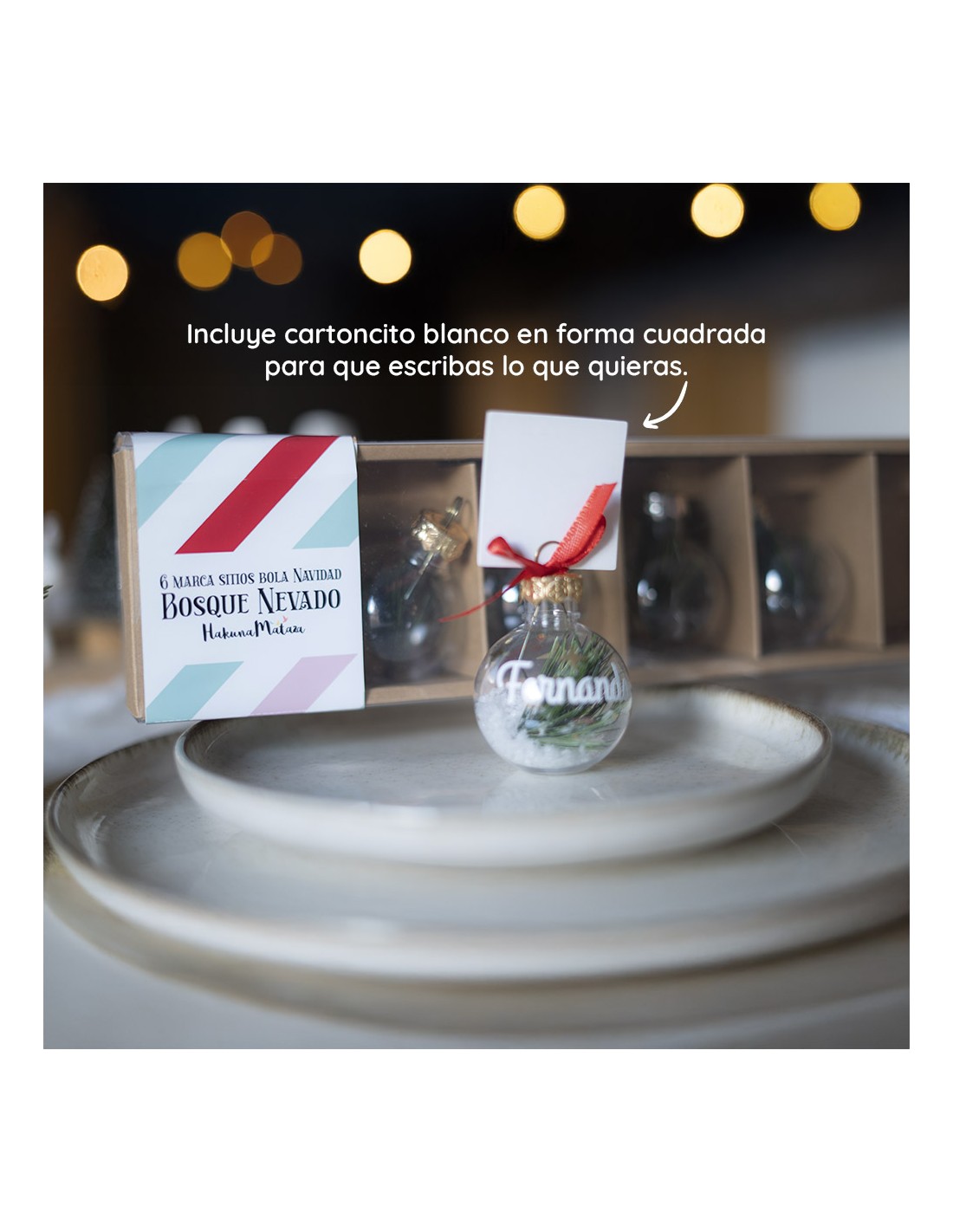 Set de 6 bolas marcasitio de plástico 5,5 cm, rellenas de nieve y pino, personalizadas con nombre en vinilo blanco y estrellas doradas. Incluye cartoncito cuadrado en blanco para escribir una pequeña nota.