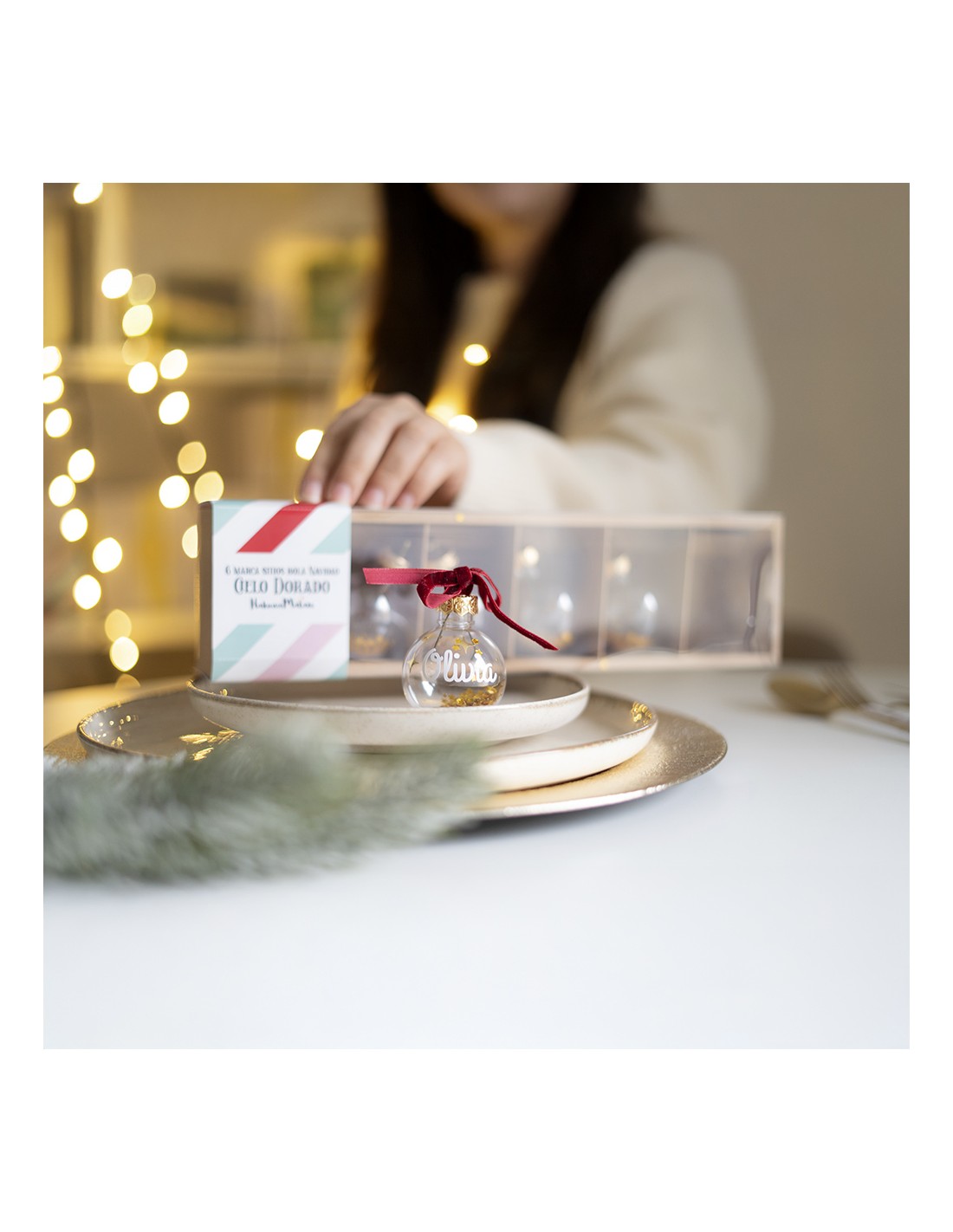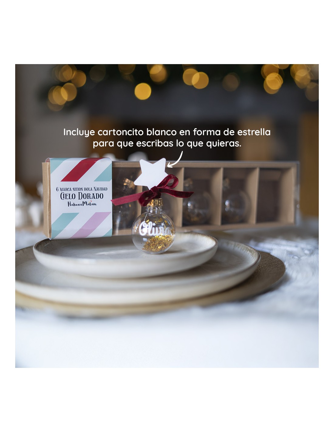 Este pack de 6 bolas marcasitio “Cielo dorado” es el detalle perfecto para vestir tu mesa con un toque brillante y personalizado. Cada bola combina elegancia, delicadeza y espíritu festivo.