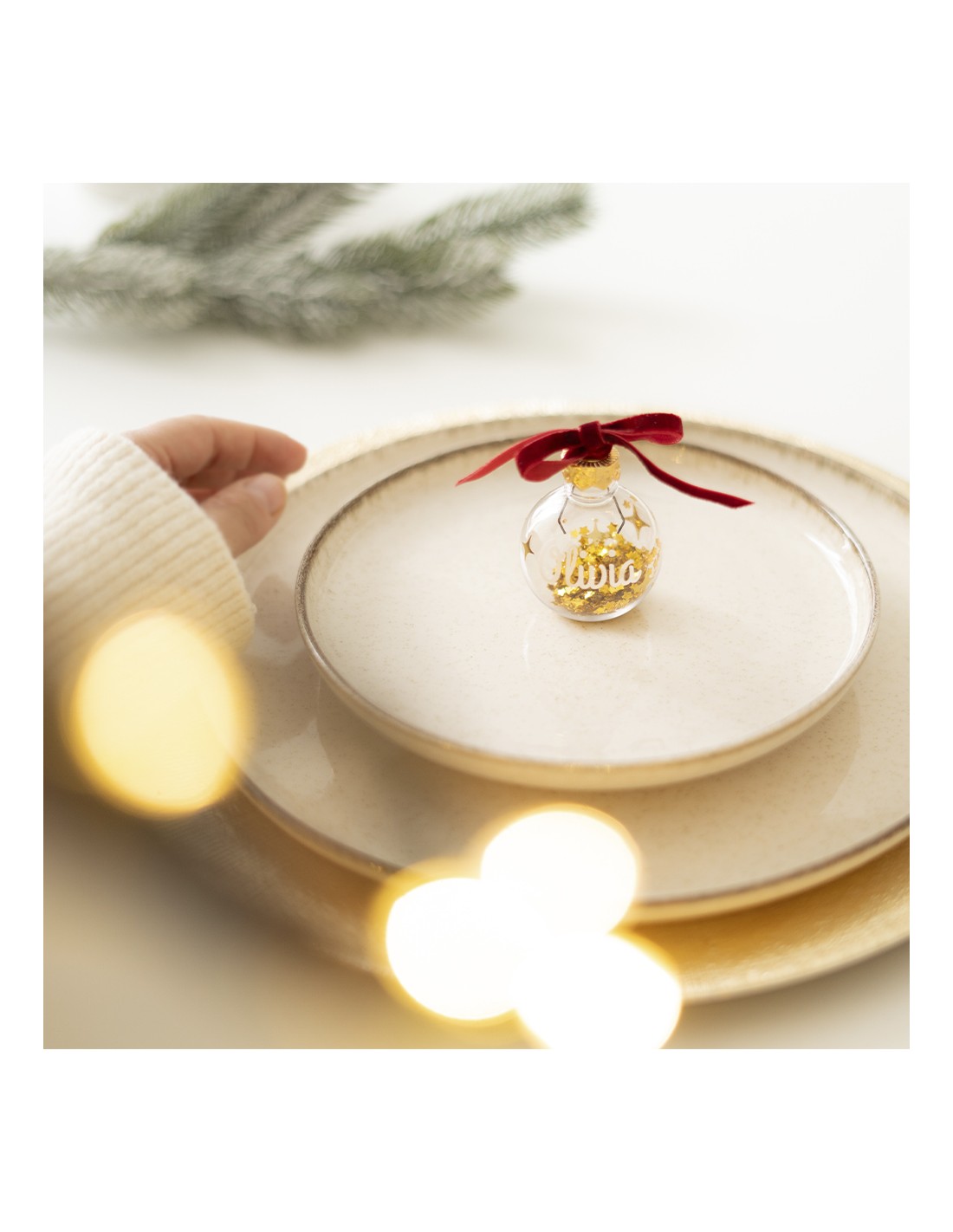 Personaliza con encanto: cada bola lleva el nombre en vinilo blanco con estrellas doradas, rellena con pequeñas estrellas doradas en su interior y un lazo satén burdeos que aporta calidez. Además, incluyen un cartoncito en forma de estrella para escribir el nombre o una nota especial.