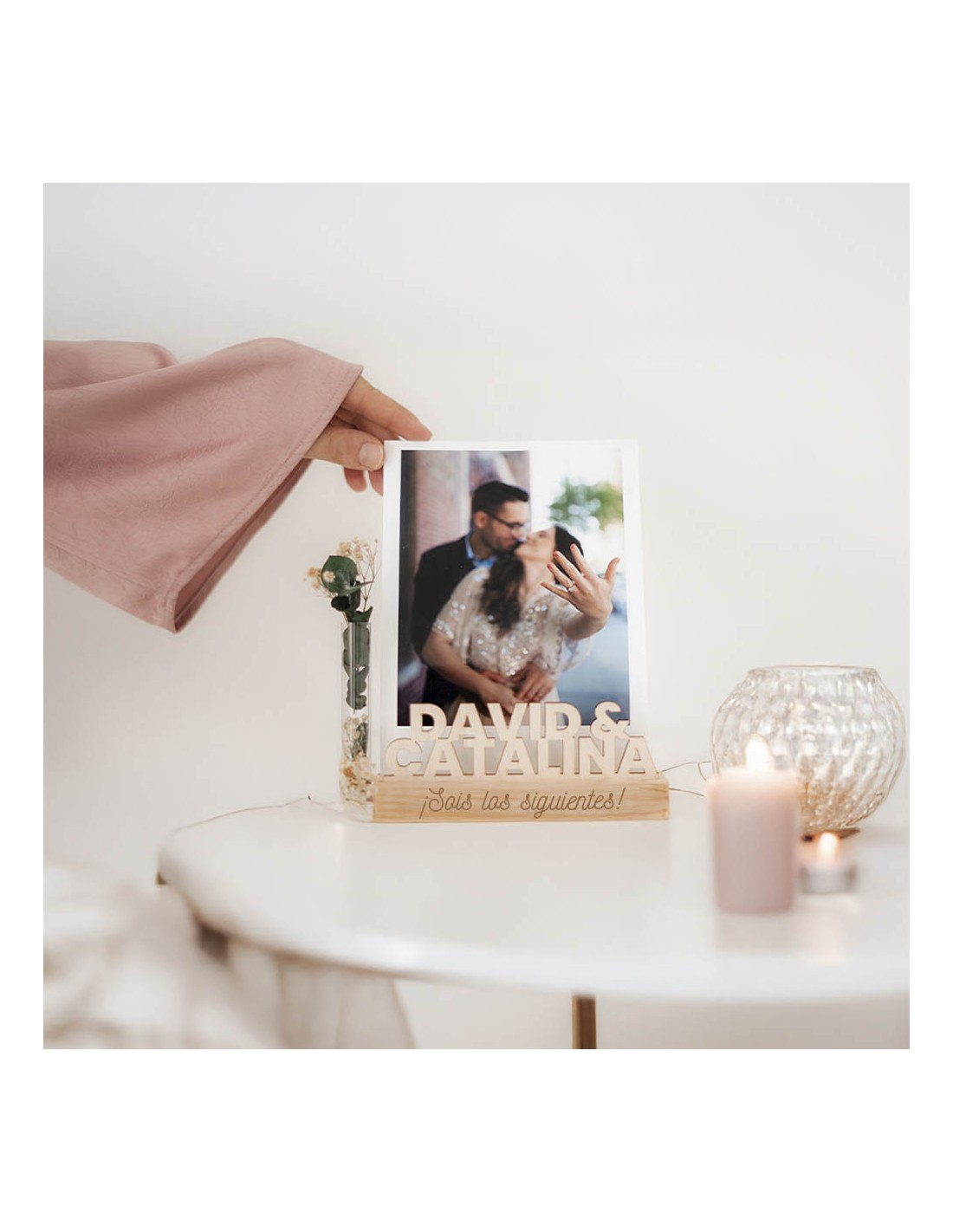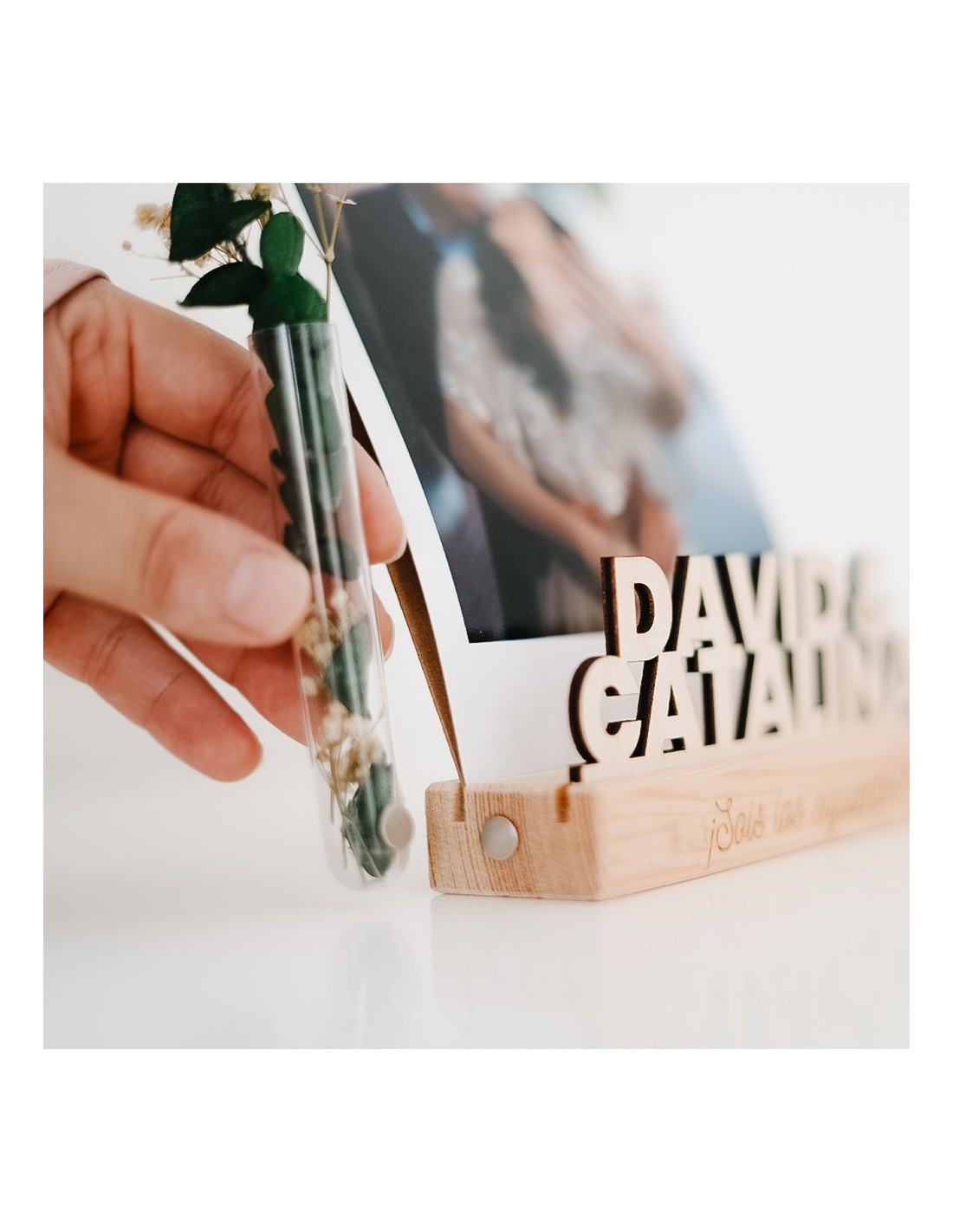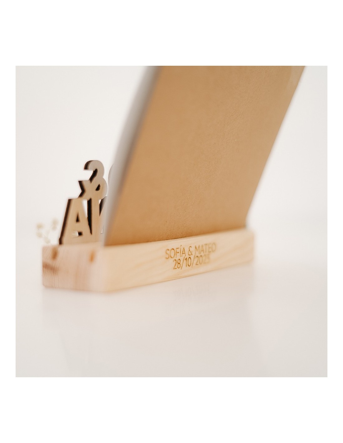Personalización a medida: Este soporte único tiene dos ranuras: una para los nombres cortados en madera sólida (unidos con "&"), y otra para insertar tu foto estilo Polaroid en formato vertical. El nombre más largo irá en la parte inferior para generar armonía visual. La tipografía de la parte trasera será siempre igual a la que ves en el ejemplo. Además, grabamos una frase especial a láser en el frontal, que tú eliges para inmortalizar un mensaje emotivo.