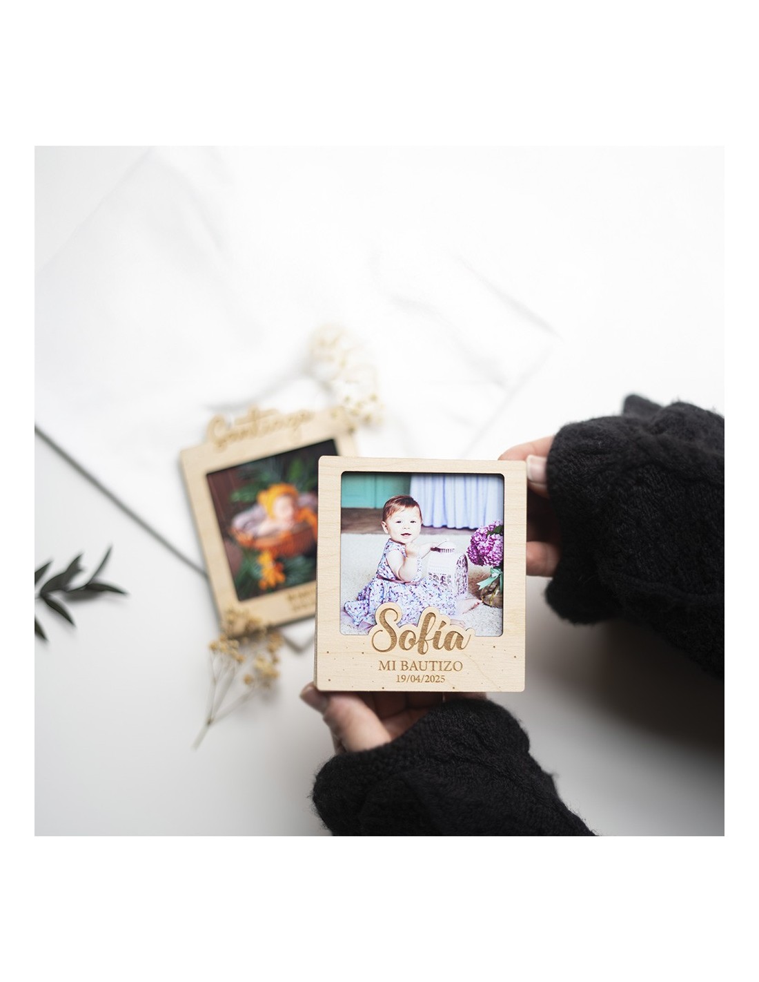 Marco recordatorio polaroid - Relieve. Un recuerdo que emociona: marco de madera natural con tu foto favorita y el nombre en relieve.