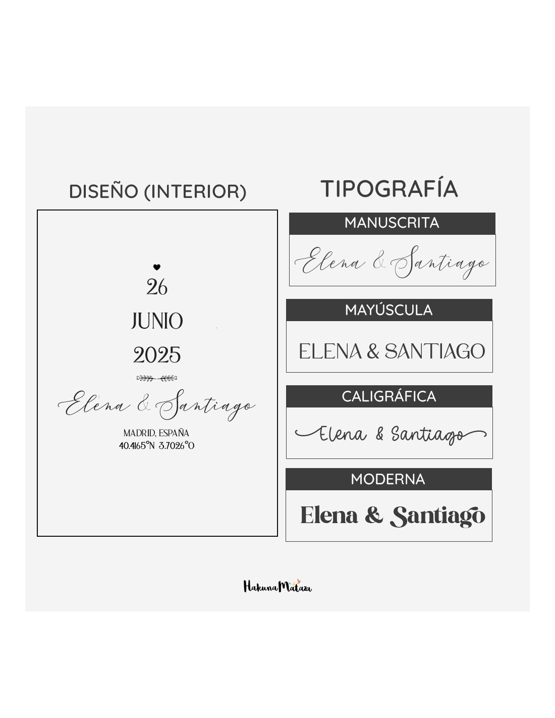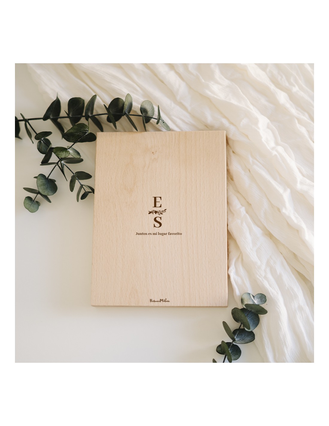 El diseño incluye iniciales, nombres, fecha y texto que puedes personalizar a tu gusto. Un regalo único que será atesorado durante años.