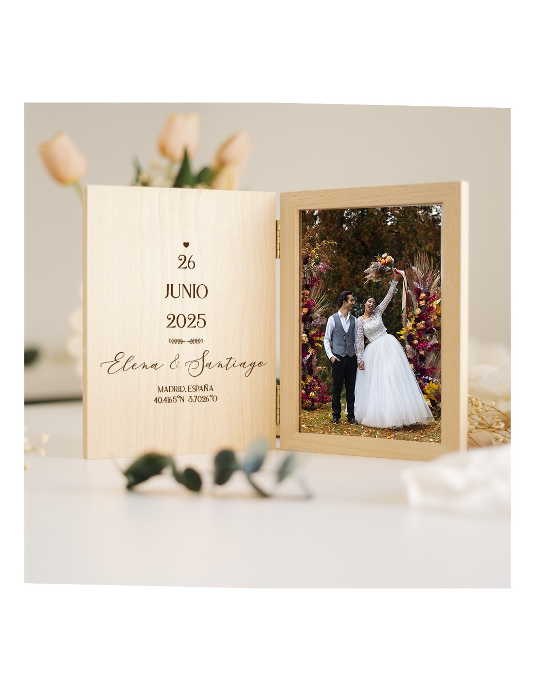 El marco libro está fabricado en madera natural, con bisagras metálicas resistentes que permiten abrirlo como un libro. Incluye una ventana de metacrilato para proteger la foto que personalices.