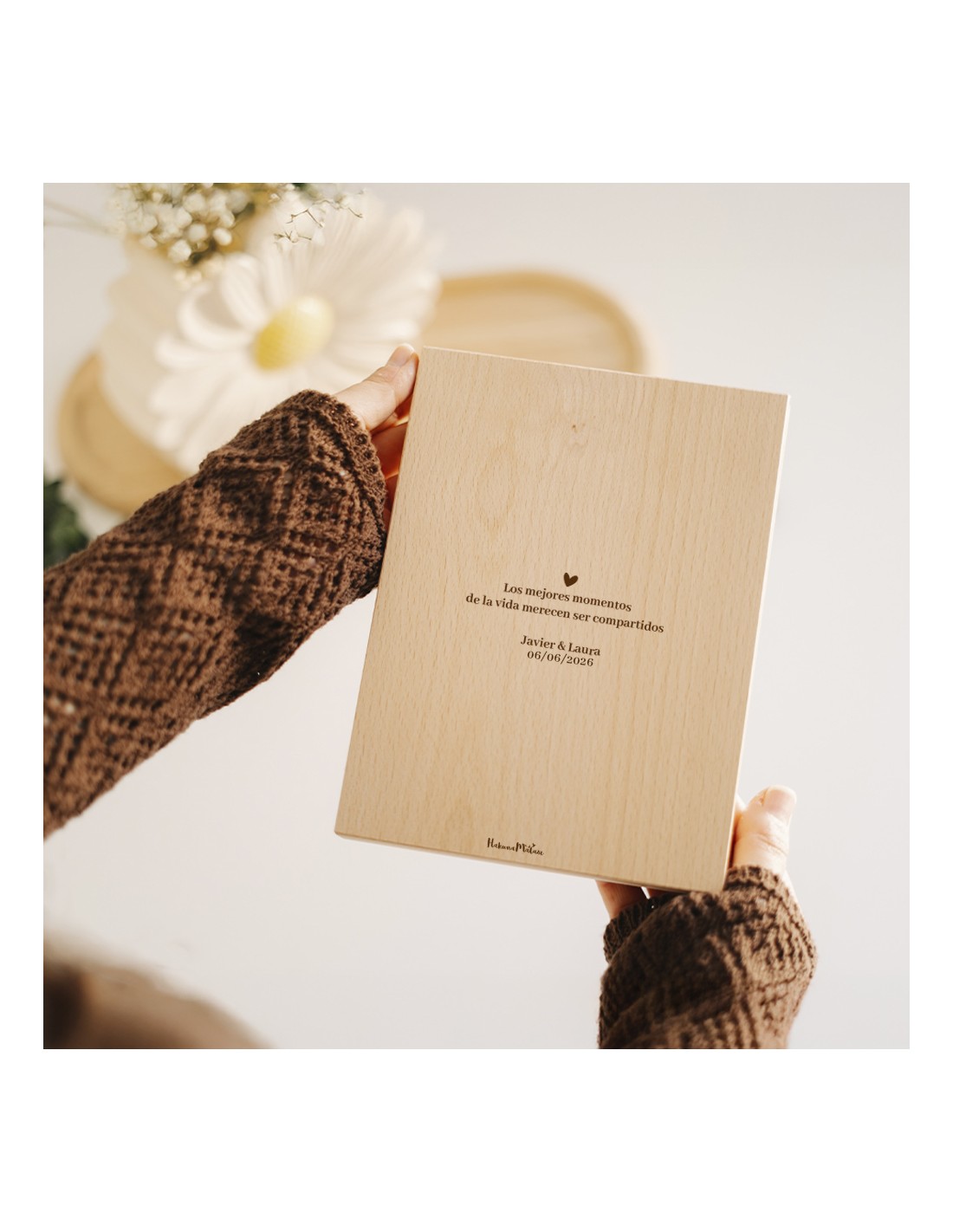 Cada pieza tiene vetas, nudos y tonalidades propias. No existen dos marcos iguales, y ahí está precisamente su encanto. Estas variaciones forman parte de la autenticidad del producto y hacen que tu regalo sea verdaderamente único.