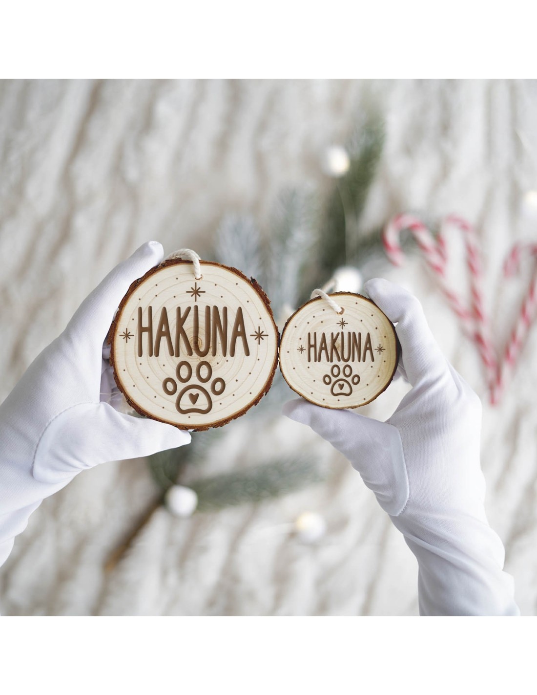 Rodaja de madera natural con dibujo de huella de perro y nombre grabado, convirtiéndola en un detalle único para tu árbol de Navidad.