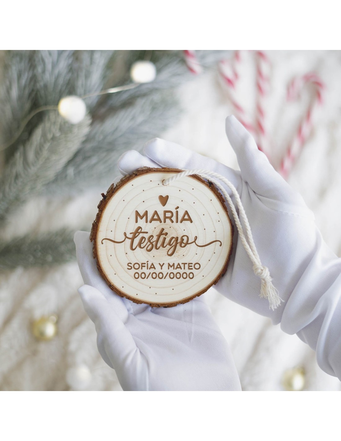 Rodaja de madera natural personalizada con nombre, cargo (“testigo” u otro), nombres y fecha grabados, convirtiéndola en un detalle único.