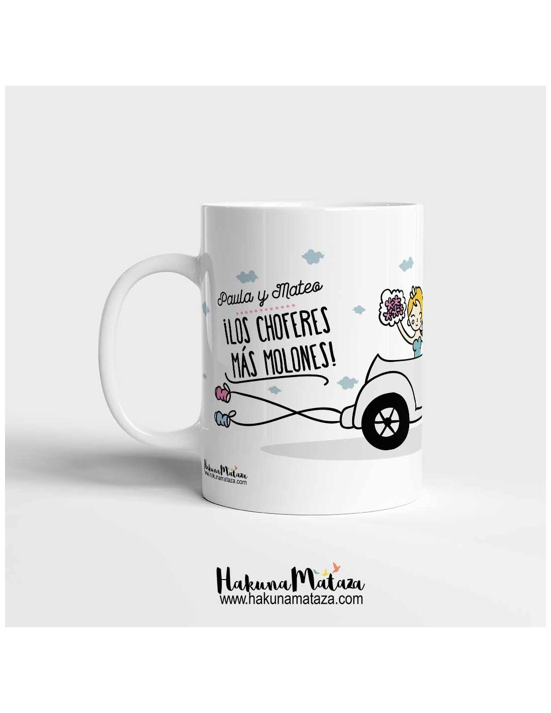 Personaliza los personajes, añade nombres, fecha y conviértela en un recuerdo inolvidable. El texto incluye “Los chóferes más molones” y los nombres de los novios al otro lado.