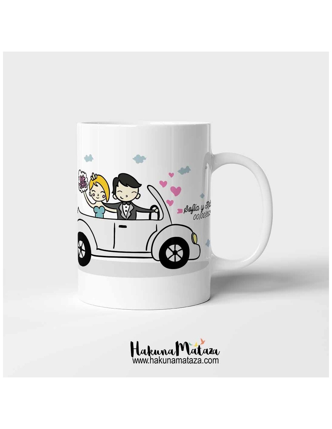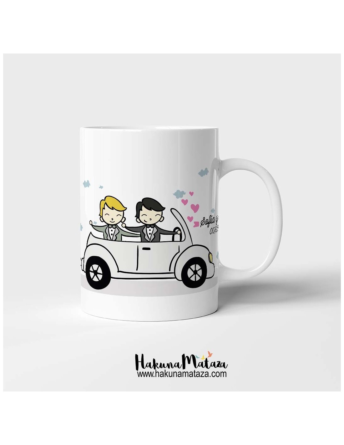 ¡Dedicada a los que siempre llegan al altar a tiempo! Esta taza personalizada con ilustración de coche y dos choferes divertidos es perfecta para sorprender a quienes tienen un papel especial en tu gran día.