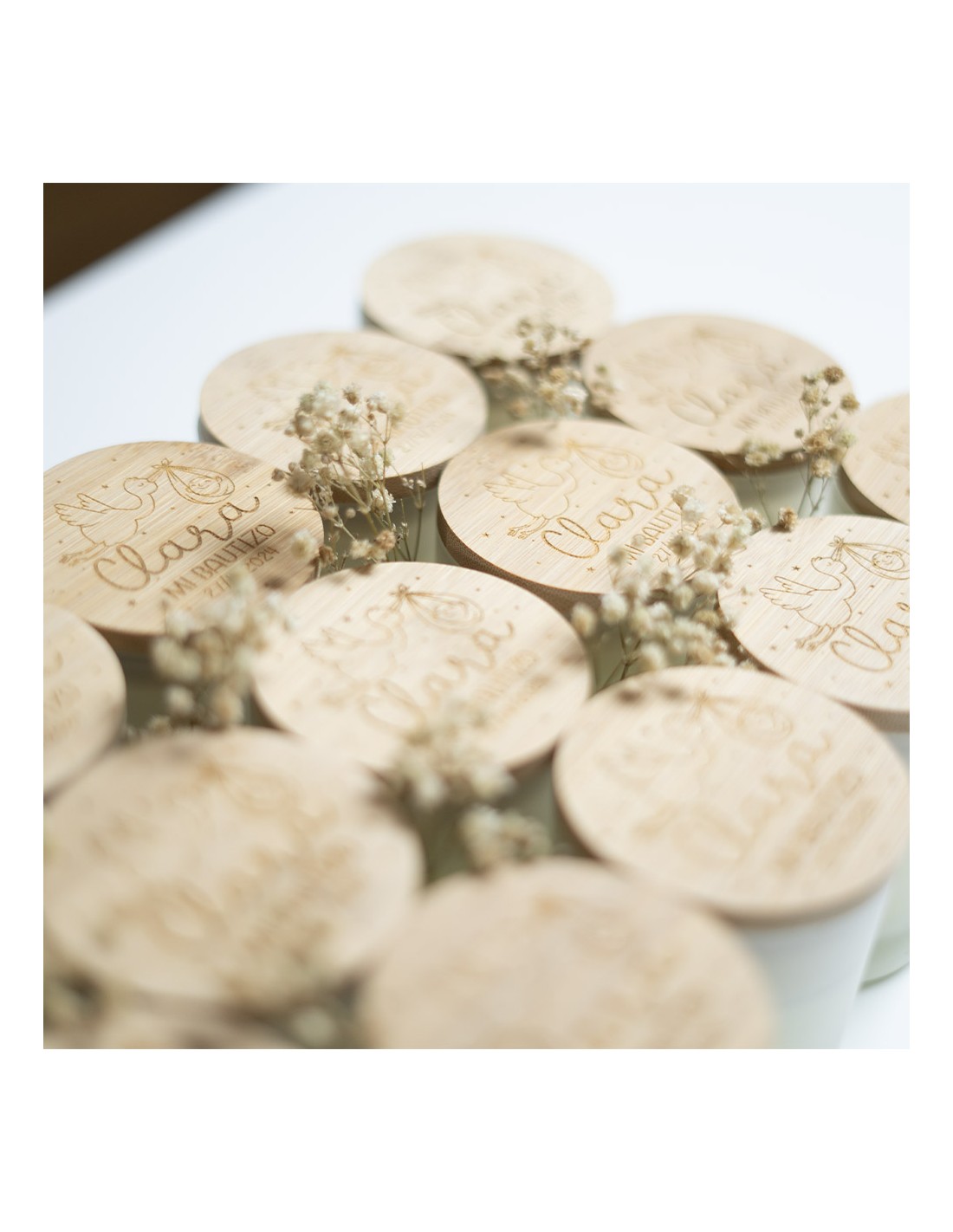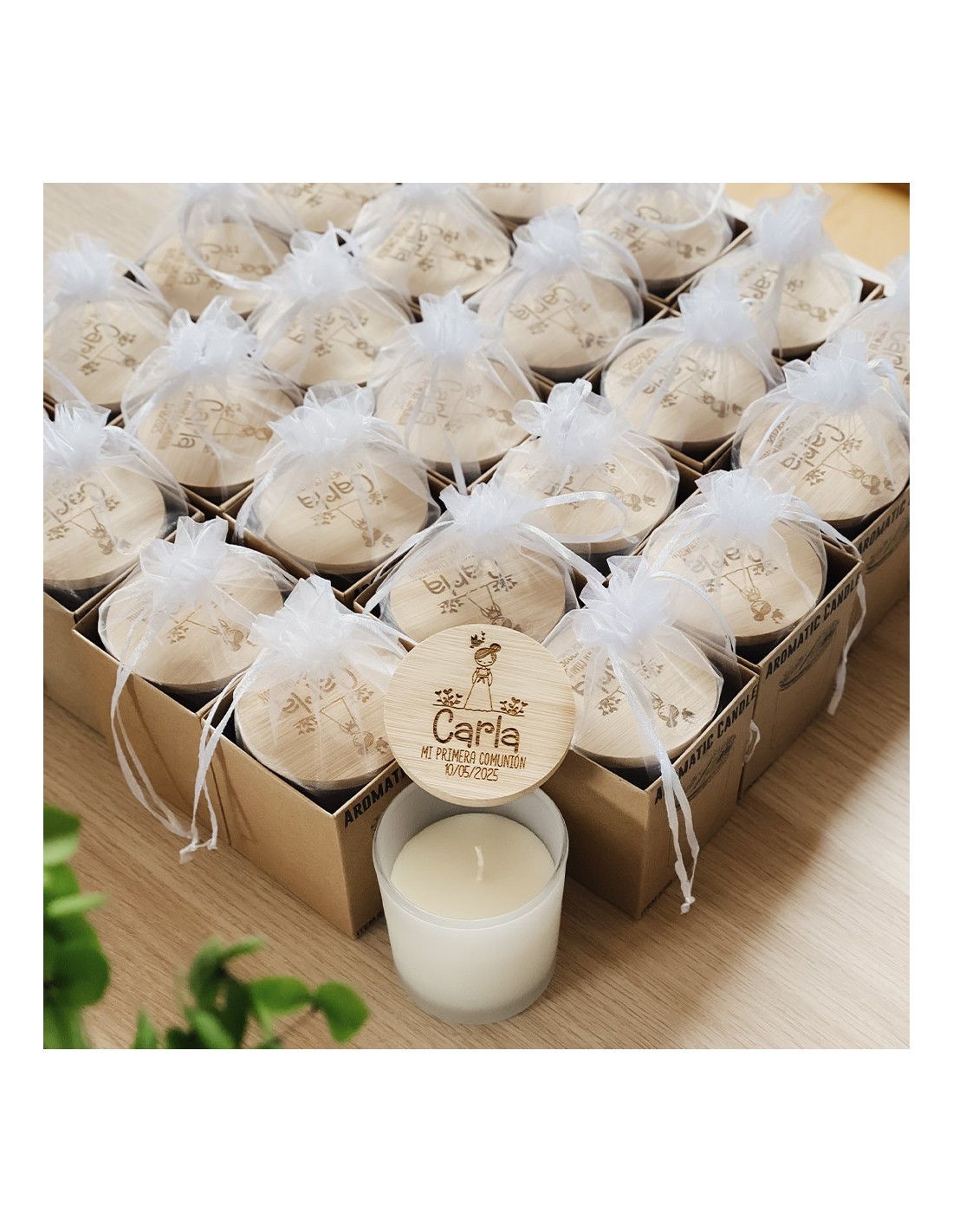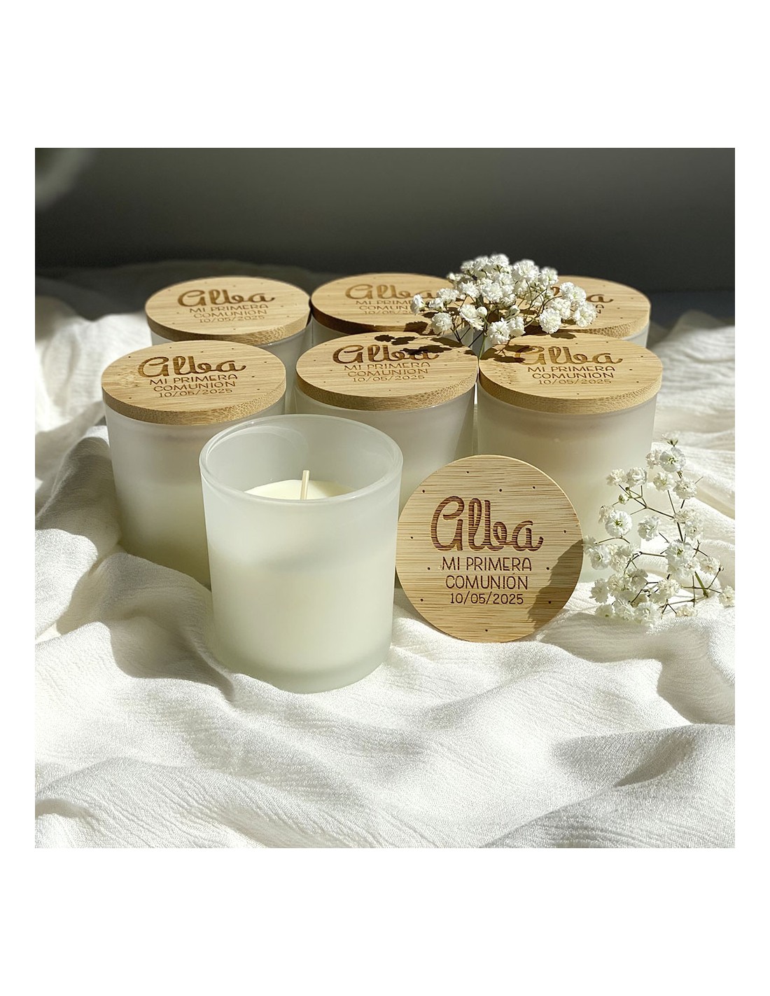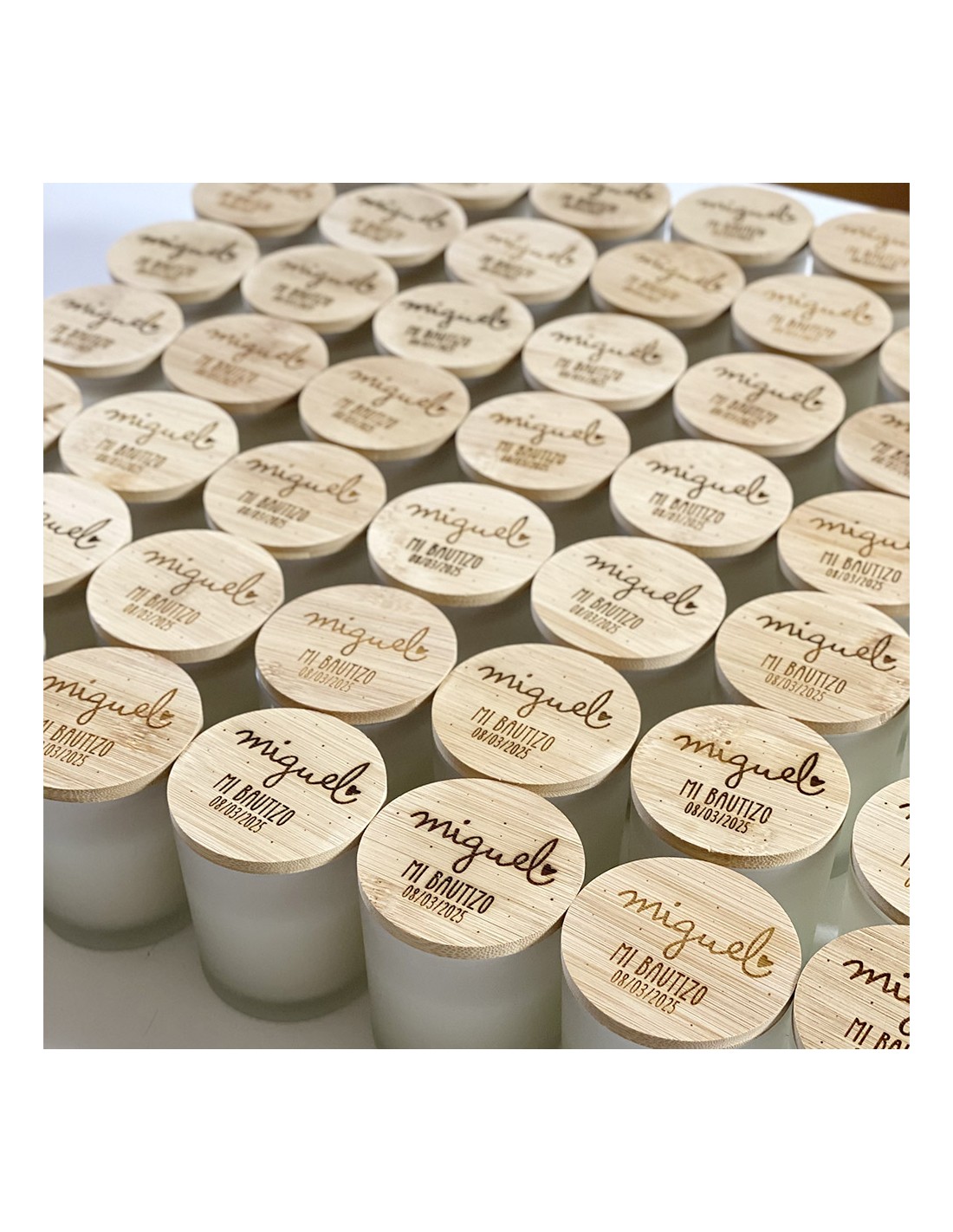 Nuestras velas personalizadas de cristal con tapa de bambú combinan un diseño elegante, un aroma envolvente y la magia de la personalización. Son perfectas para decorar, relajarte o regalar en momentos únicos como bautizos, comuniones, bodas, aniversarios o cumpleaños.